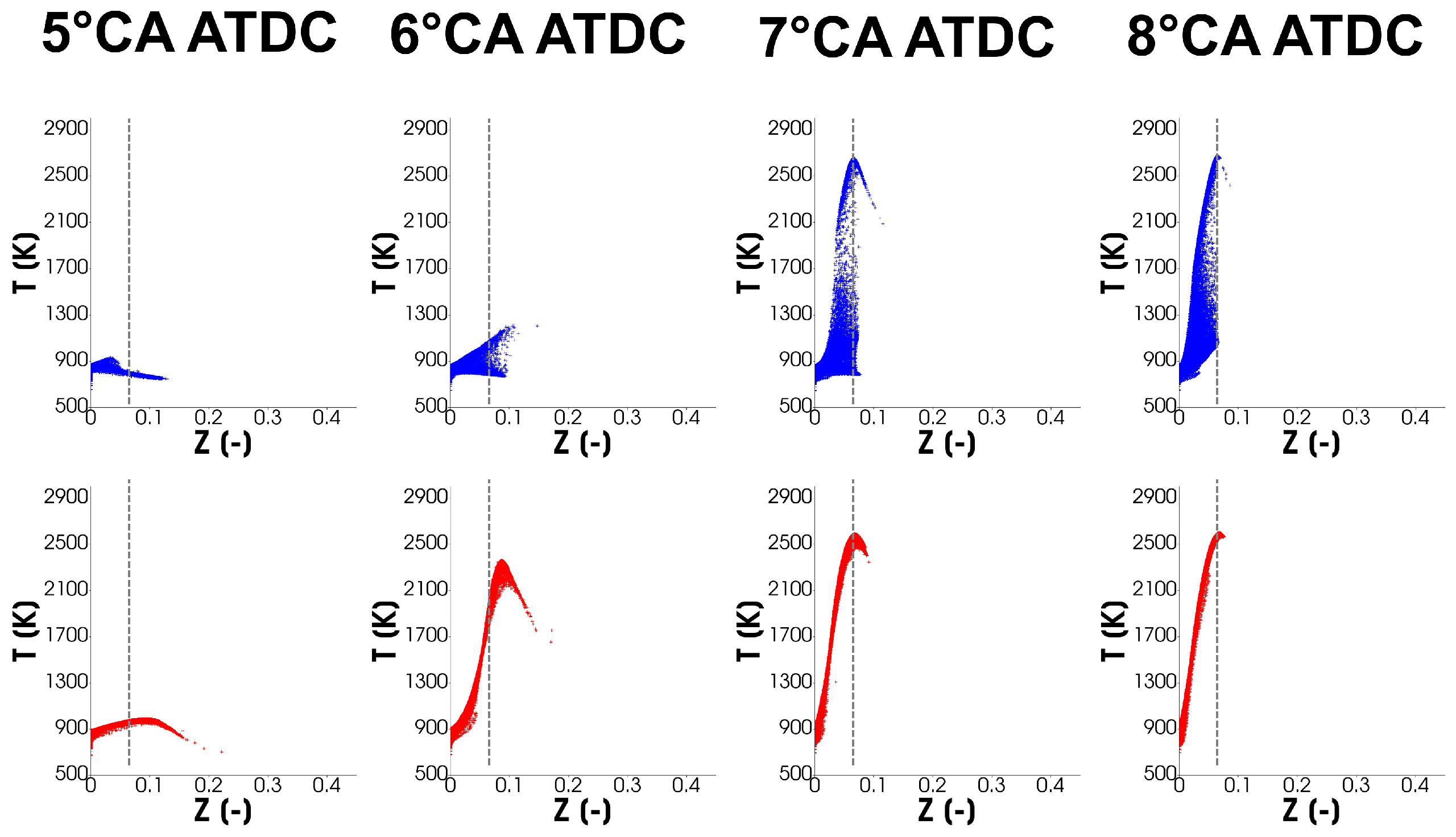 - Lucchini, T.; Schirru, A.; Mehl, M.; D’Errico, G.; Rorimpandey, P.; Chan, Q.N.; Kook, S.; Hawkes, E.R. Modeling hydrogen–diesel dual direct injection combustion with FGM and transported PDF. Proc. Combust. Inst. 2024, 40, 105213. [Google Scholar] [CrossRef]