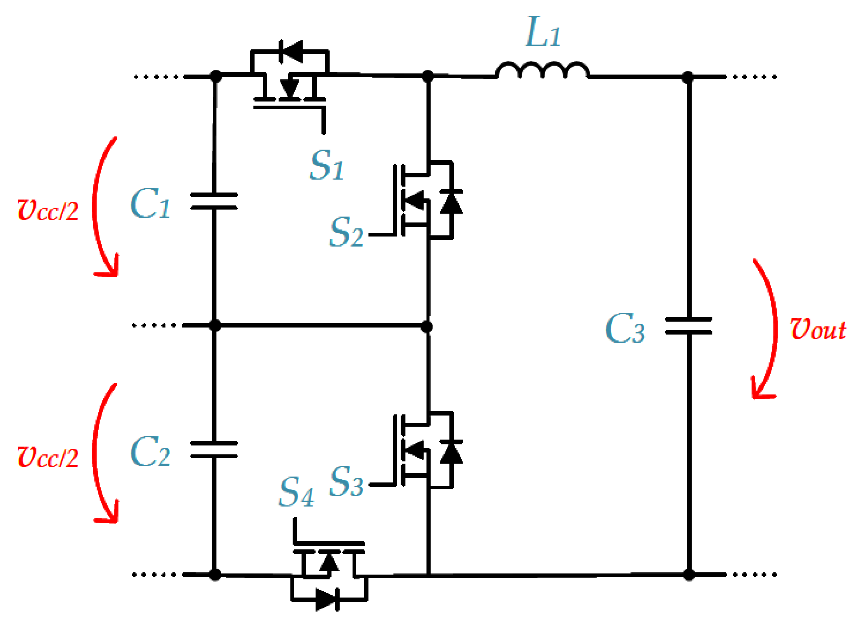 41]. It incorporates four semiconductor switches (e.g., SiC) arranged in two pairs that operate in a complementary manner to generate the AC output waveform. The capacitors (