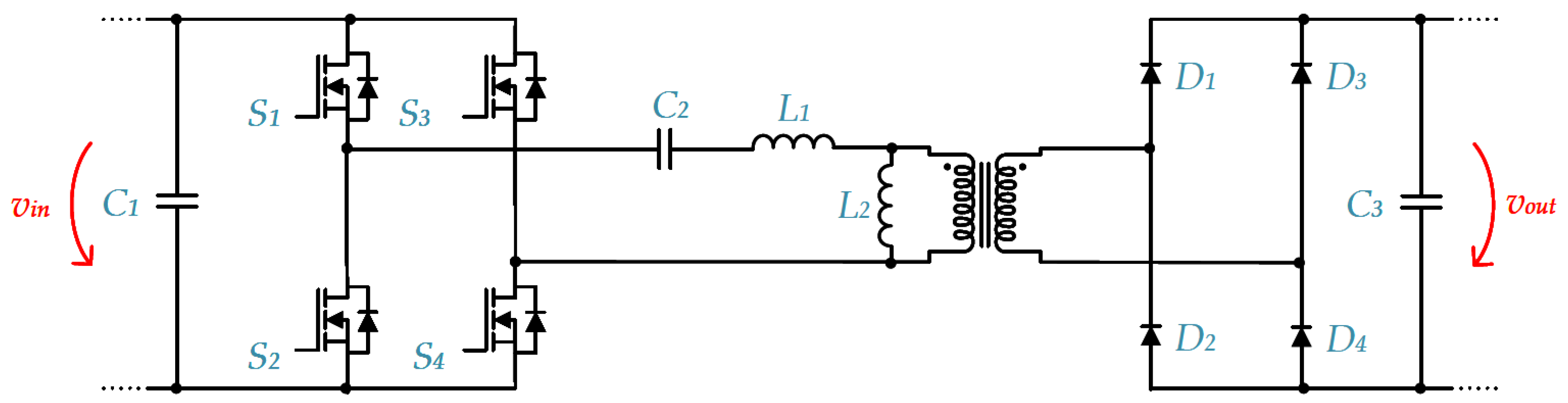 L2). Unlike conventional converters that rely primarily on PWM techniques, where the duty-cycle of the switching signals is modulated to regulate the output voltage, LLC resonant converters employ a control strategy based on frequency modulation. This control strategy allows the converter to operate at high switching frequencies. As a full-bridge converter, illustrated in