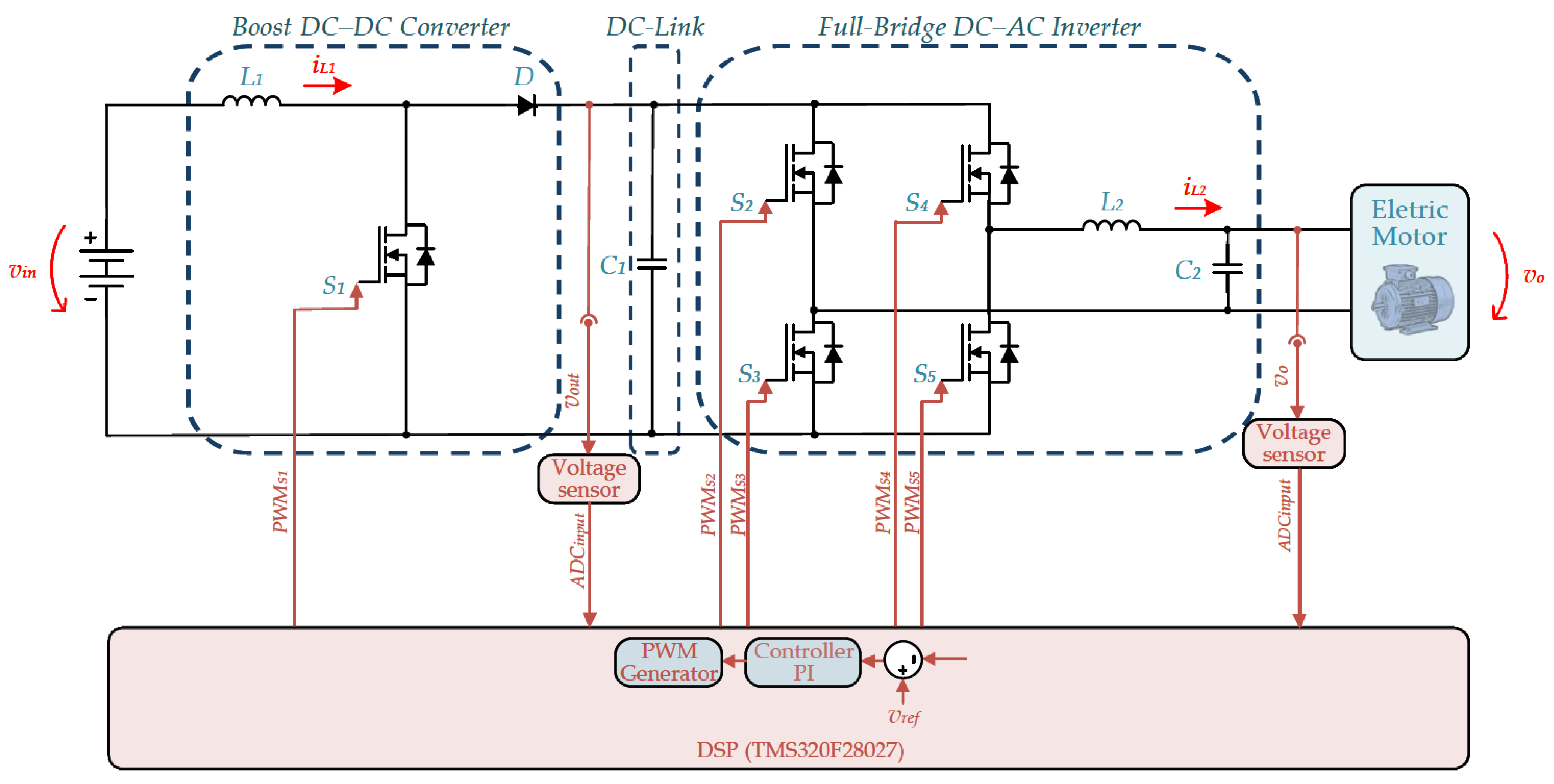 The use of these sensors enables real-time monitoring of the system’s critical variables, providing essential information to the digital controller responsible for adjusting the PWM signal of the semiconductor devices. This ensures stable operation and voltage regulation under different load conditions.