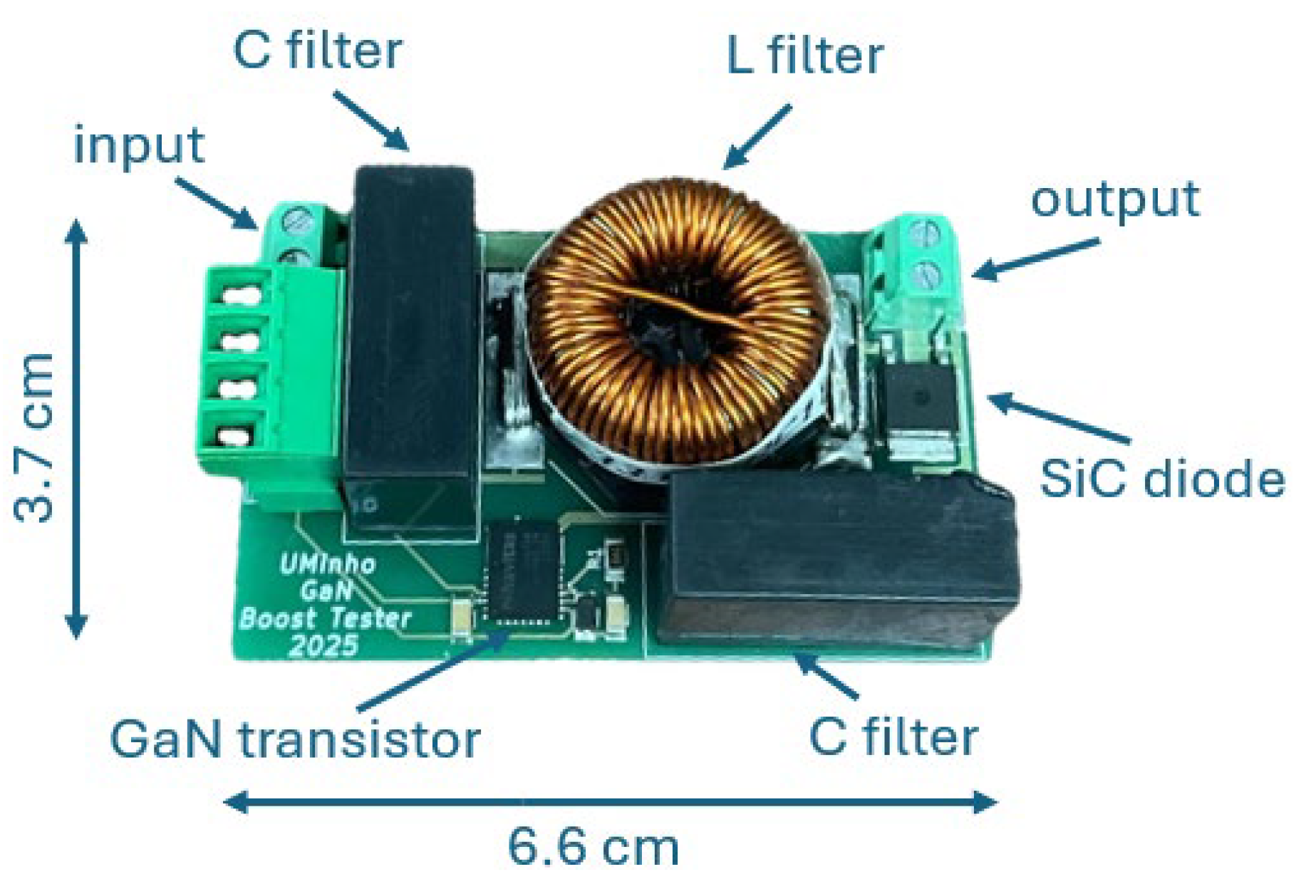 To evaluate the performance of GaN semiconductors under realistic operating conditions, an experimental prototype of a DC–DC boost converter was developed. This circuit allows the assessment of critical operating parameters such as switching speed, power losses, and system stability prior to integration into the final DC–AC converter prototype.