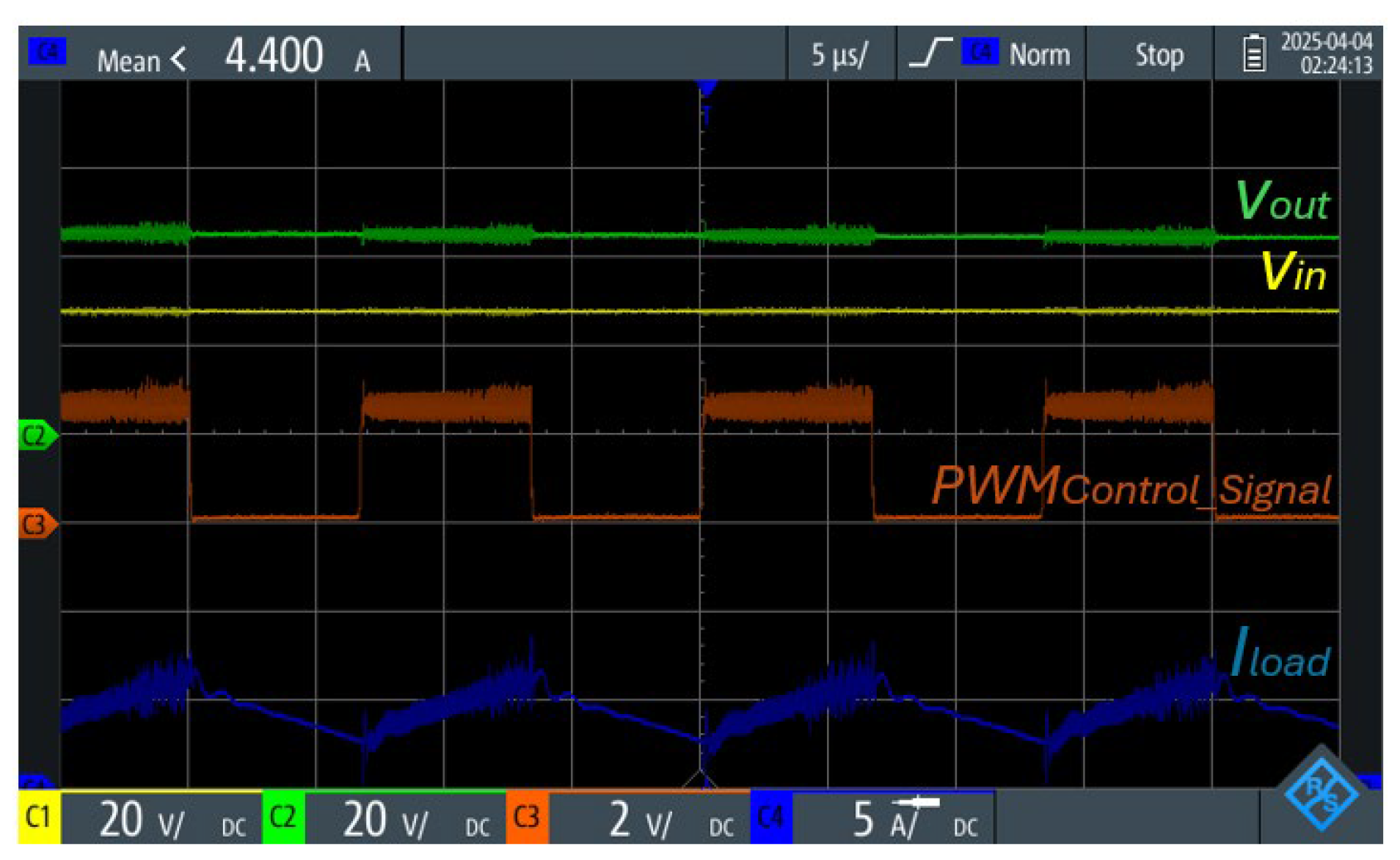 Figure 11 presents experimentally measured waveforms obtained with an input voltage of 30 V, a switching frequency of 75 kHz, and a resistive load of 100 Ω. The figure shows the gate-drive signal and the corresponding voltage and current waveforms, highlighting the PWM switching process and the converter’s response. The average current measured at the load was approximately 0.9 A, corresponding to an output voltage of around 60 V across the 100 Ω resistor, which is consistent with the voltage-boosting function of the converter under the tested conditions. The observed waveforms demonstrate stable operating behavior, with a ripple level compatible with the switching frequency and the characteristics of the components used.