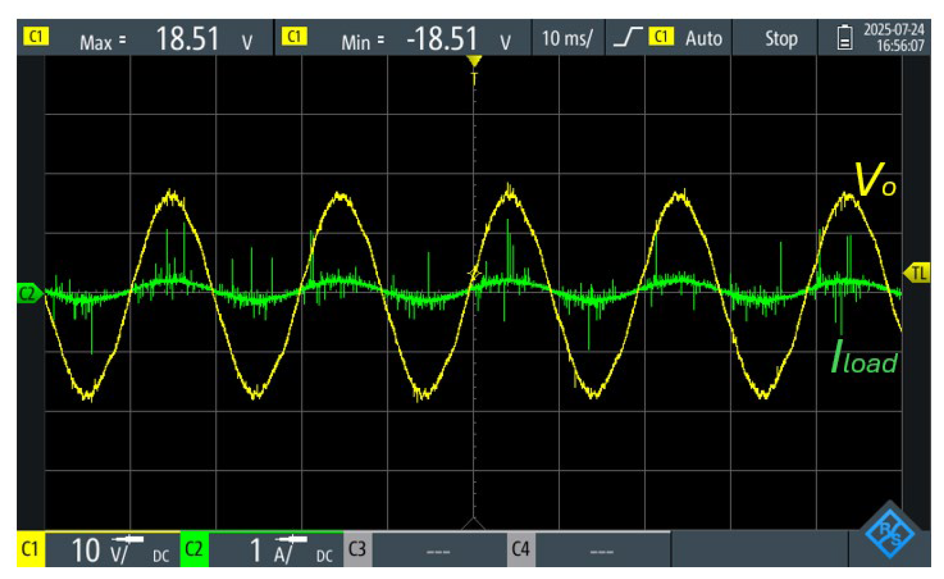 Figure 13 presents the experimental waveforms measured at the output of the full-bridge converter during open-loop operation with a resistive load. Both the voltage and current on the AC side of the load can be observed, demonstrating the generation of a sinusoidal alternating voltage from the DC input. This result validates the correct operation of the full-bridge topology and confirms the effectiveness of the implemented sinusoidal modulation strategy. It can also be seen that the voltage and current waveforms are in phase, which confirms the resistance of the load and the proper synchronization between both signals, thereby demonstrating the stability and consistency of the system’s operation under the tested conditions.