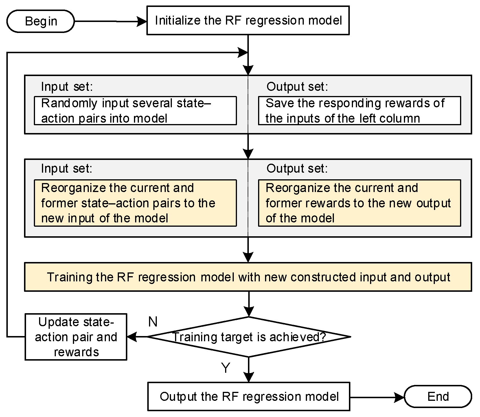 as the input set (note: they should be restricted within their operation boundary) and save the related rewards of the regressive model as the output set. Then, before training the new regression model, we combine the current state–action pair and the rewards with the input and output sets from the previous step to construct new input and output sets, and the reorganized input and output sets can be adopted to train the model. This process is repeated until the expected accuracy or the maximum training number is reached. The mechanism of reconstructing the trained results with the current input and output set facilitates the updating of the RF’s weights, and in this process the immature results will be gradually abandoned.