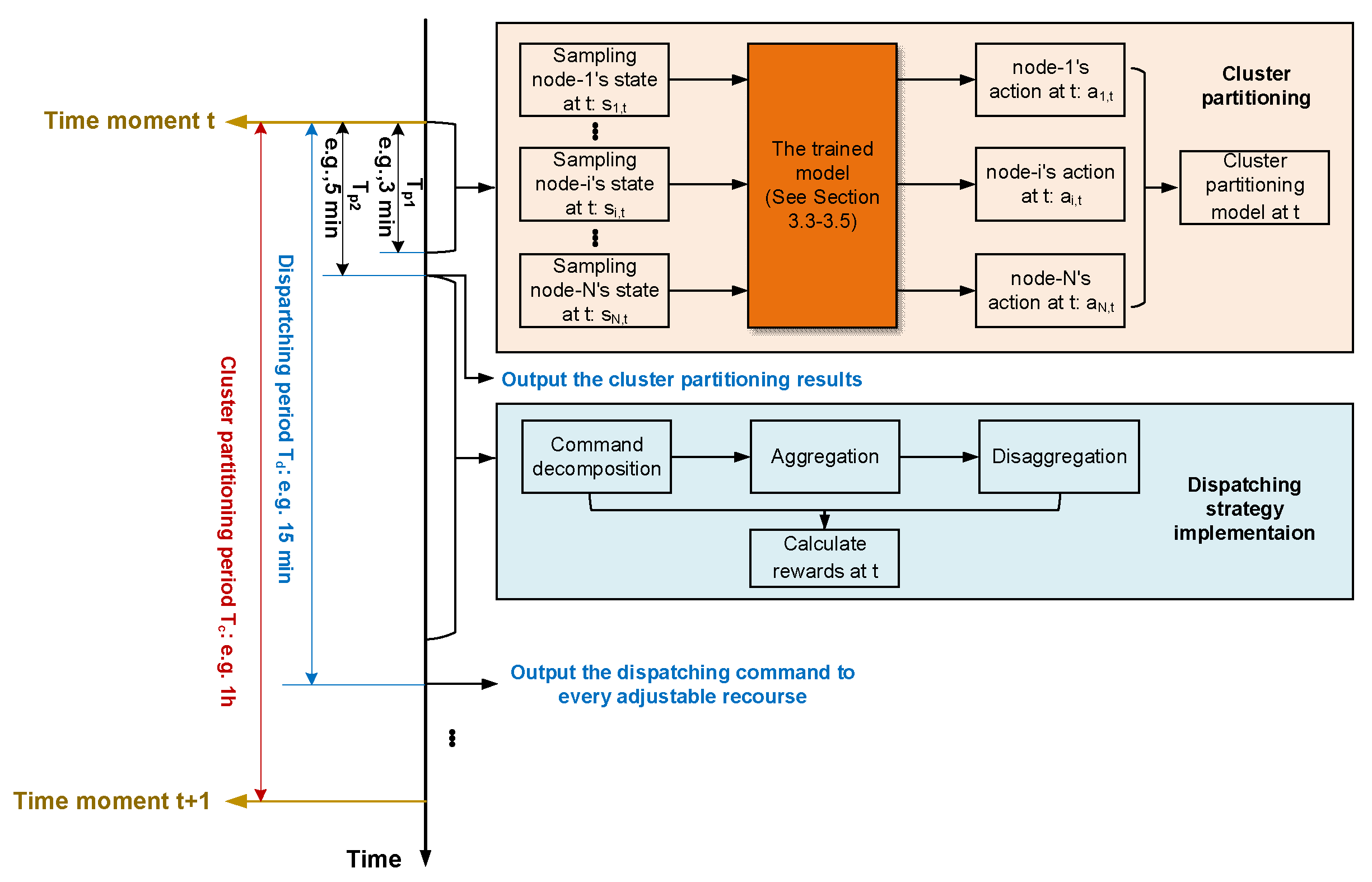 As discussed above, the application of RL shows its great potential in the field of DN optimal regulation, but little research discusses DNs’ dynamic cluster partitioning by use of an RL-based method, though this is normally regarded as a critical step in highly effective organization and control of modern DNs [