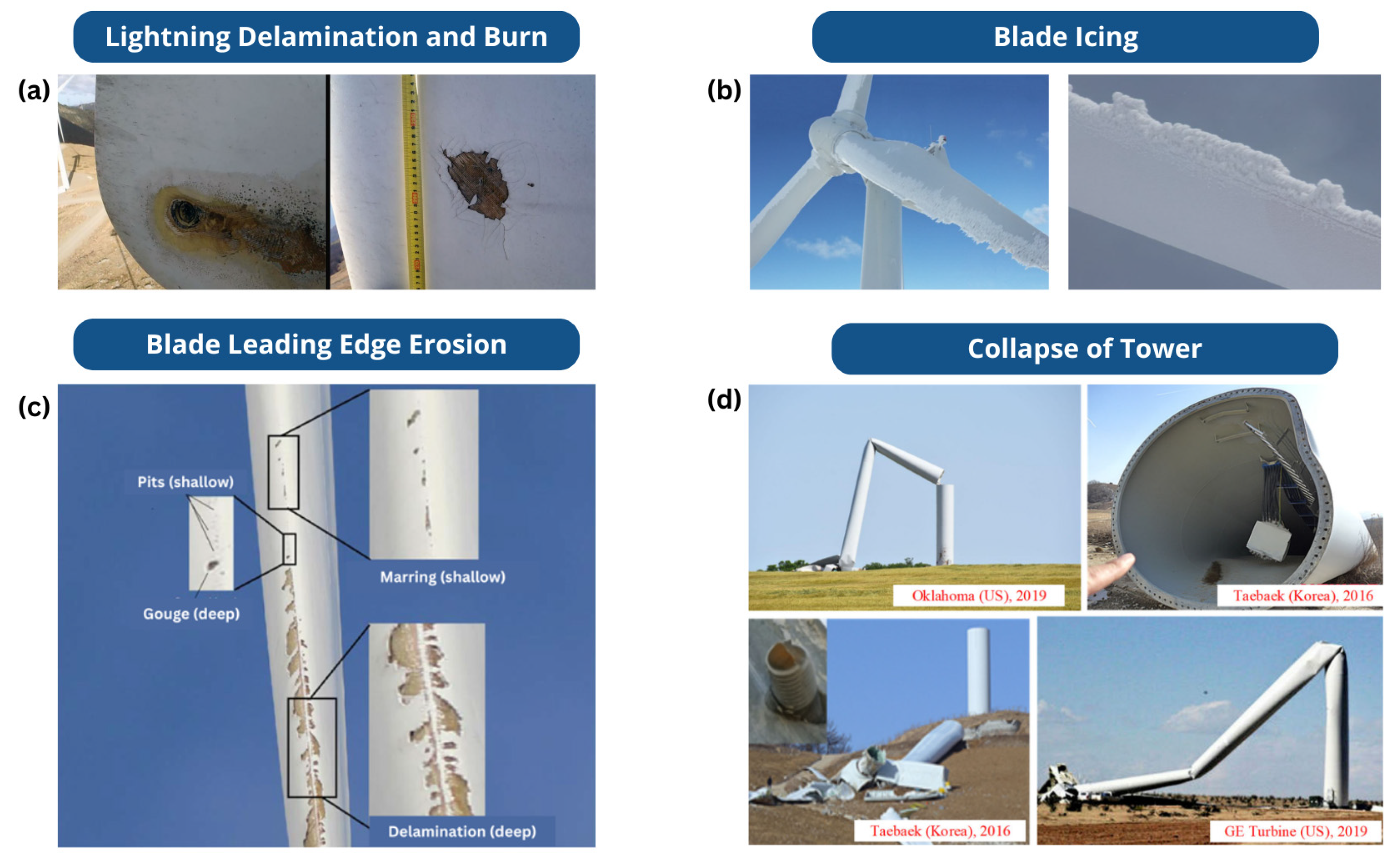 | Blade (structural) | Delamination, thermal ablation, internal “explosion”, rotor/blade failure | Lightning & extreme winds (TC/downburst) |