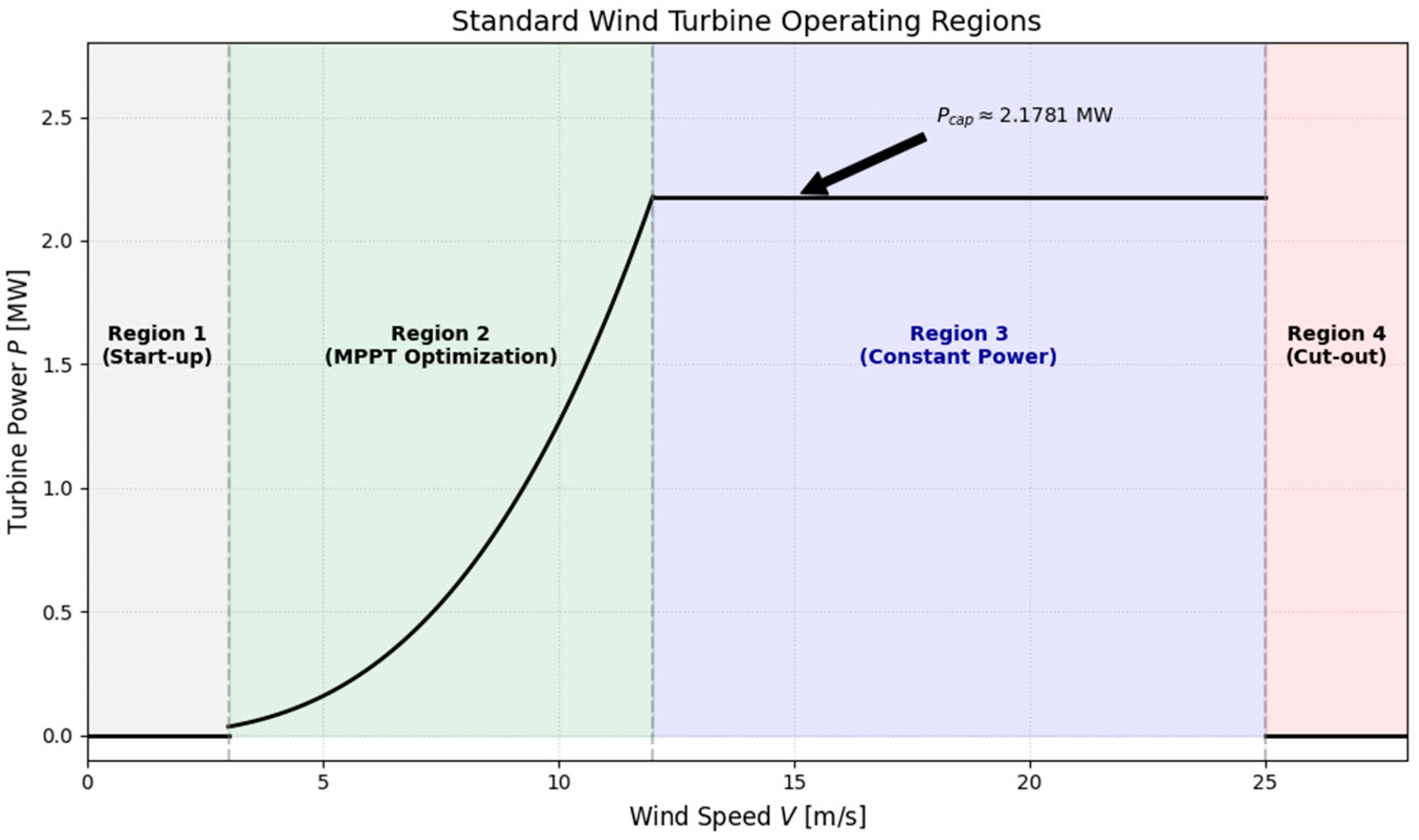 A characteristic wind turbine power curve illustrating the four standard operating regions can be seen in