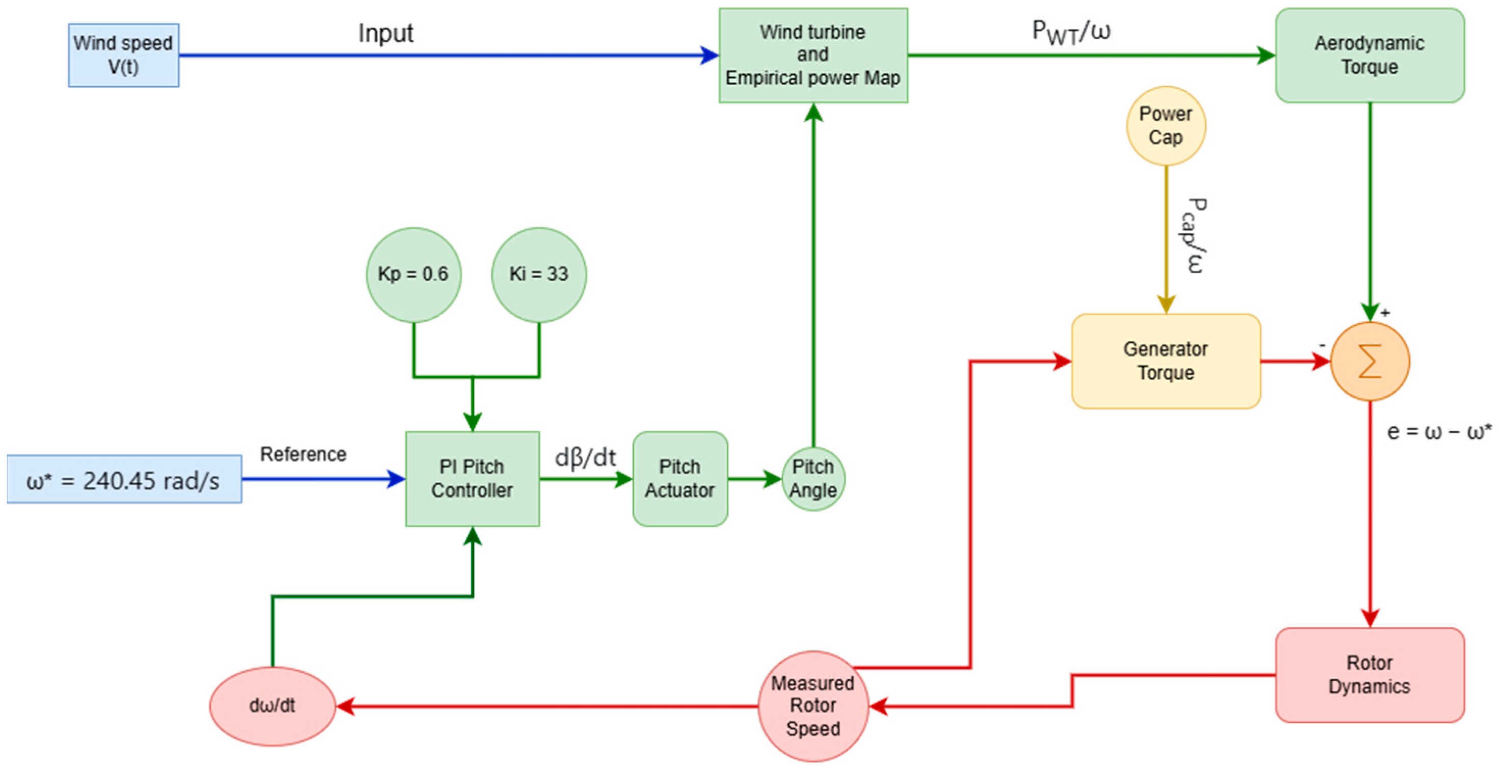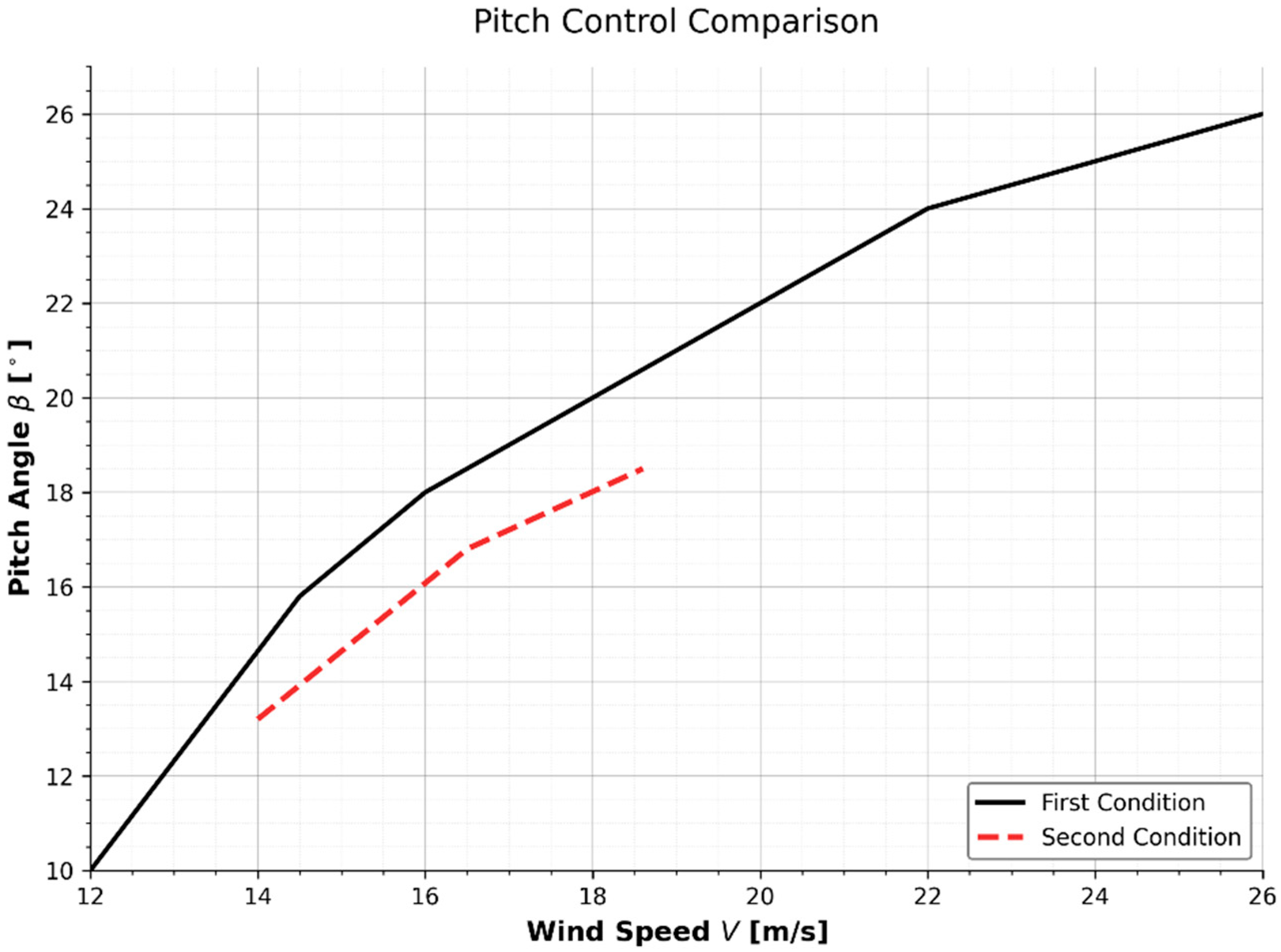 These emerging directions are directly linked to pitch control. For example, blade degradation (erosion, surface contamination) modifies the power coefficient Cp(β,λ), affecting the power curve and dynamic response of the system. Data-driven models can detect such changes and recalibrate the pitch controller or performance map. Therefore, integrating real-time monitoring, empirical power surface identification, and adaptive control enables a more resilient and cost-efficient system, ultimately reducing the levelized cost of energy.