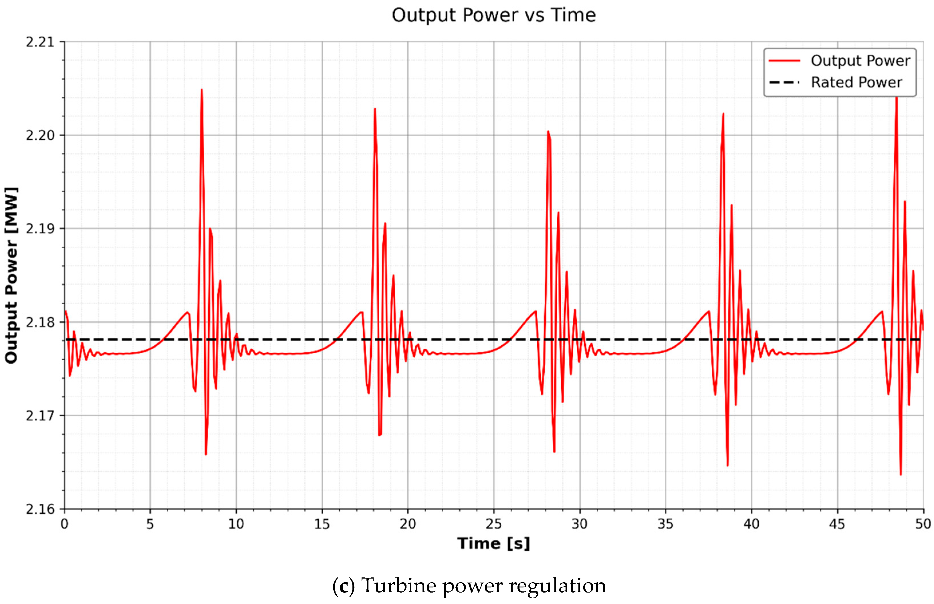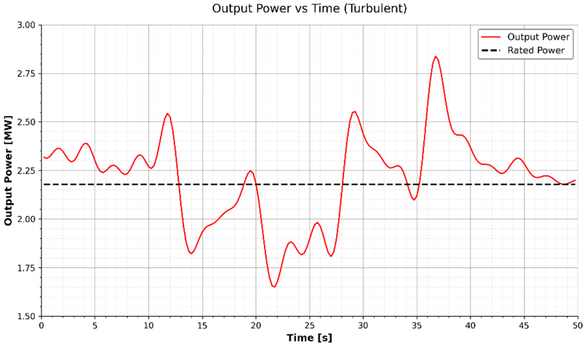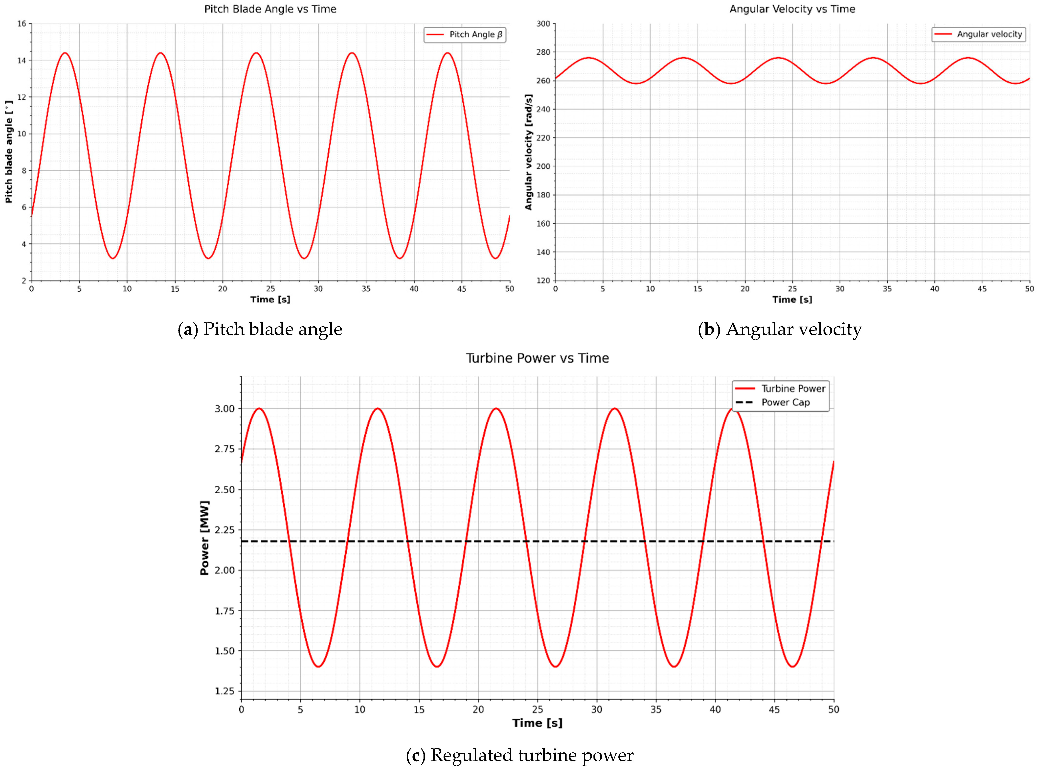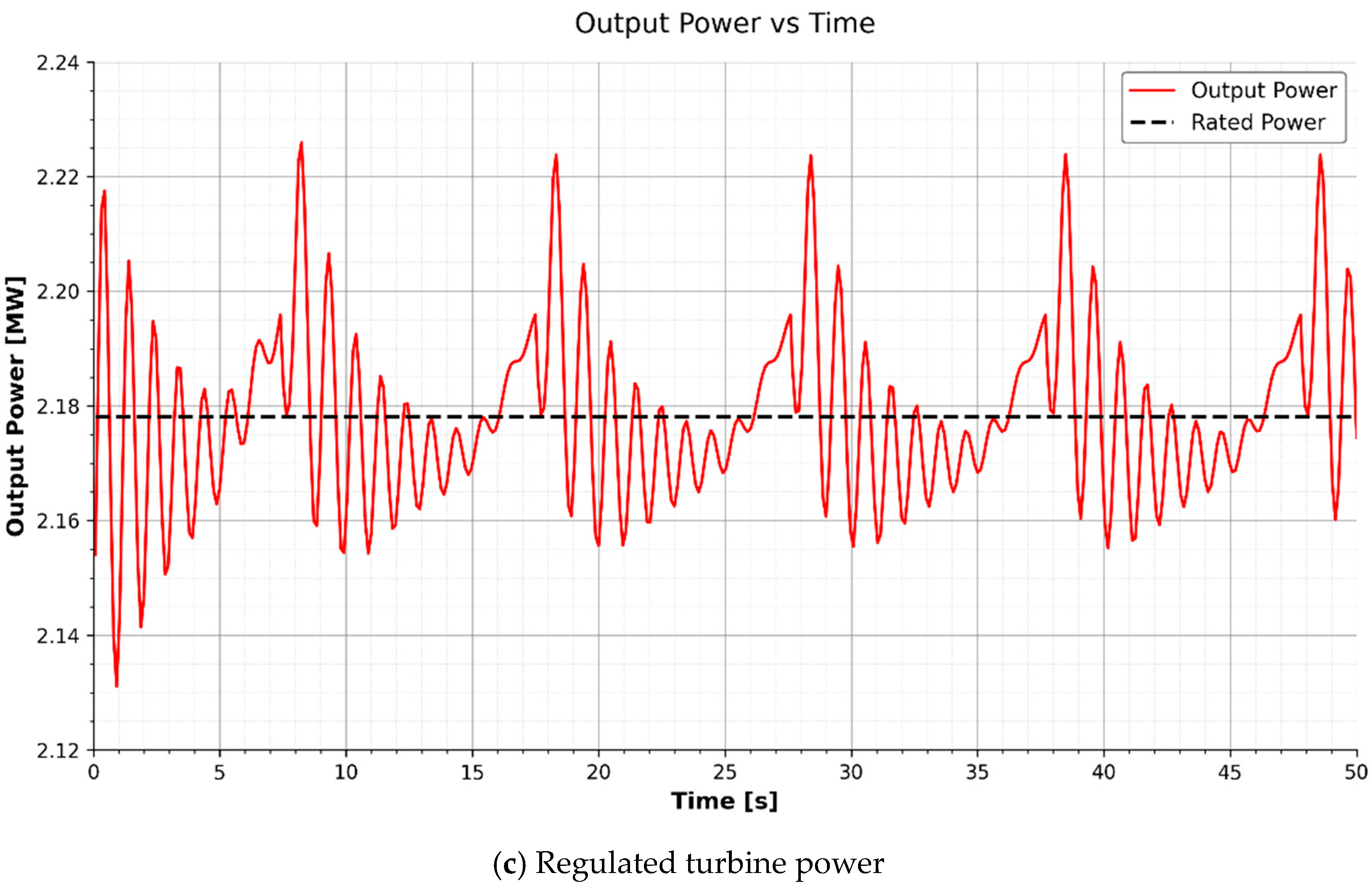 To quantify regulation performance, we compute the peak and root-mean-square (RMS) deviations of the rotor speed and output power. These metrics are calculated over the entire simulation window t ∈ [0, 50] s to capture both steady-state behavior and the controller’s response to initial transients. The metrics are defined as