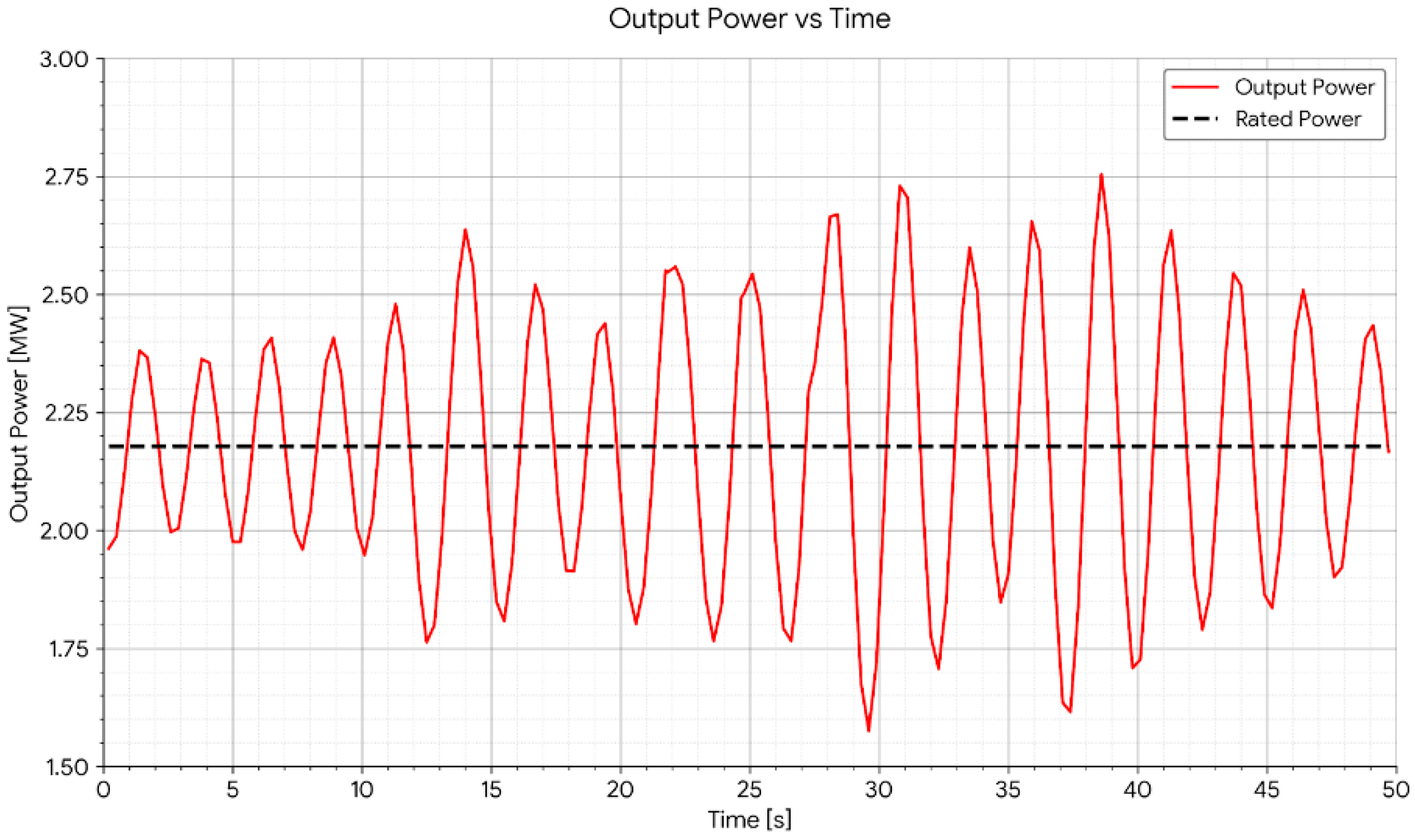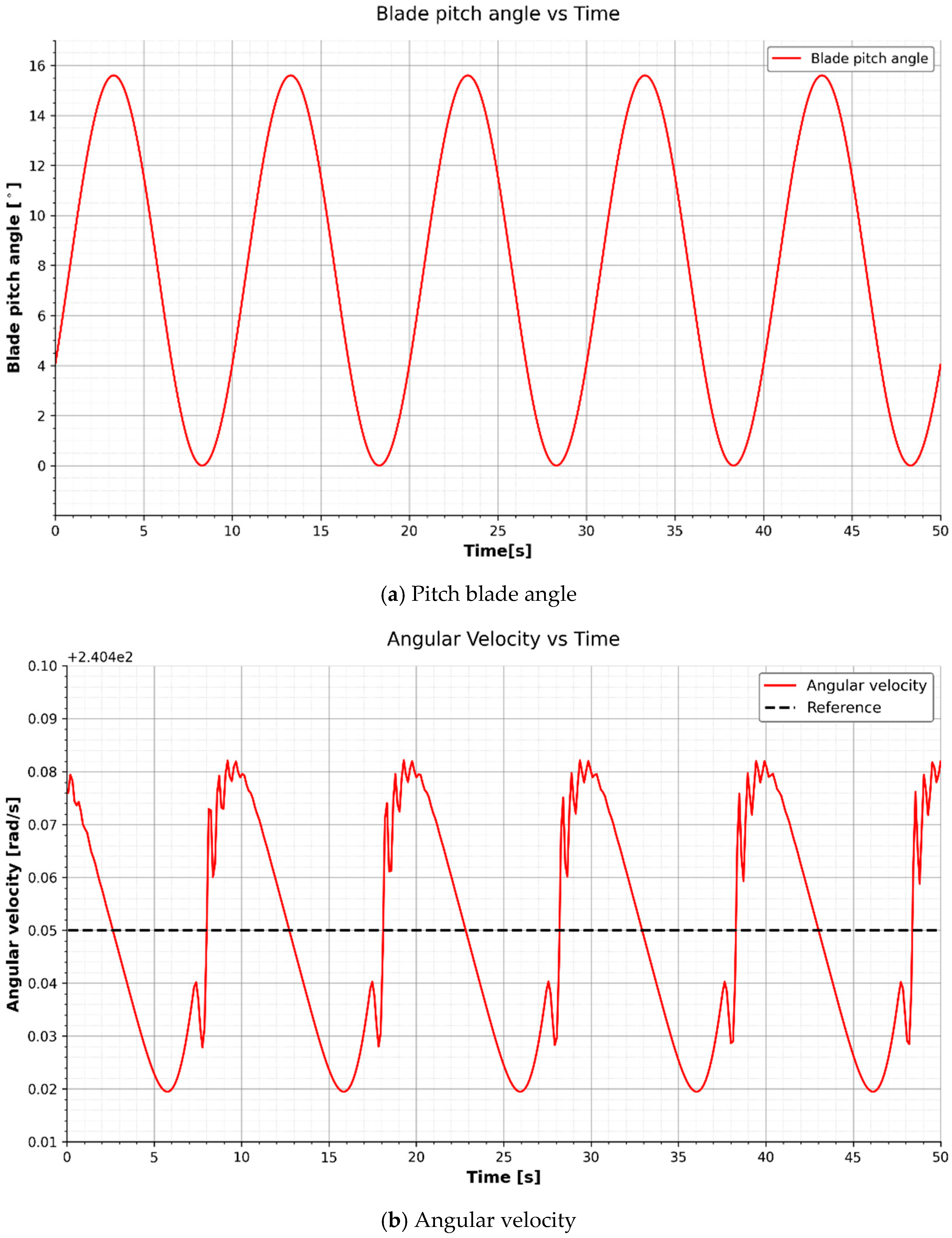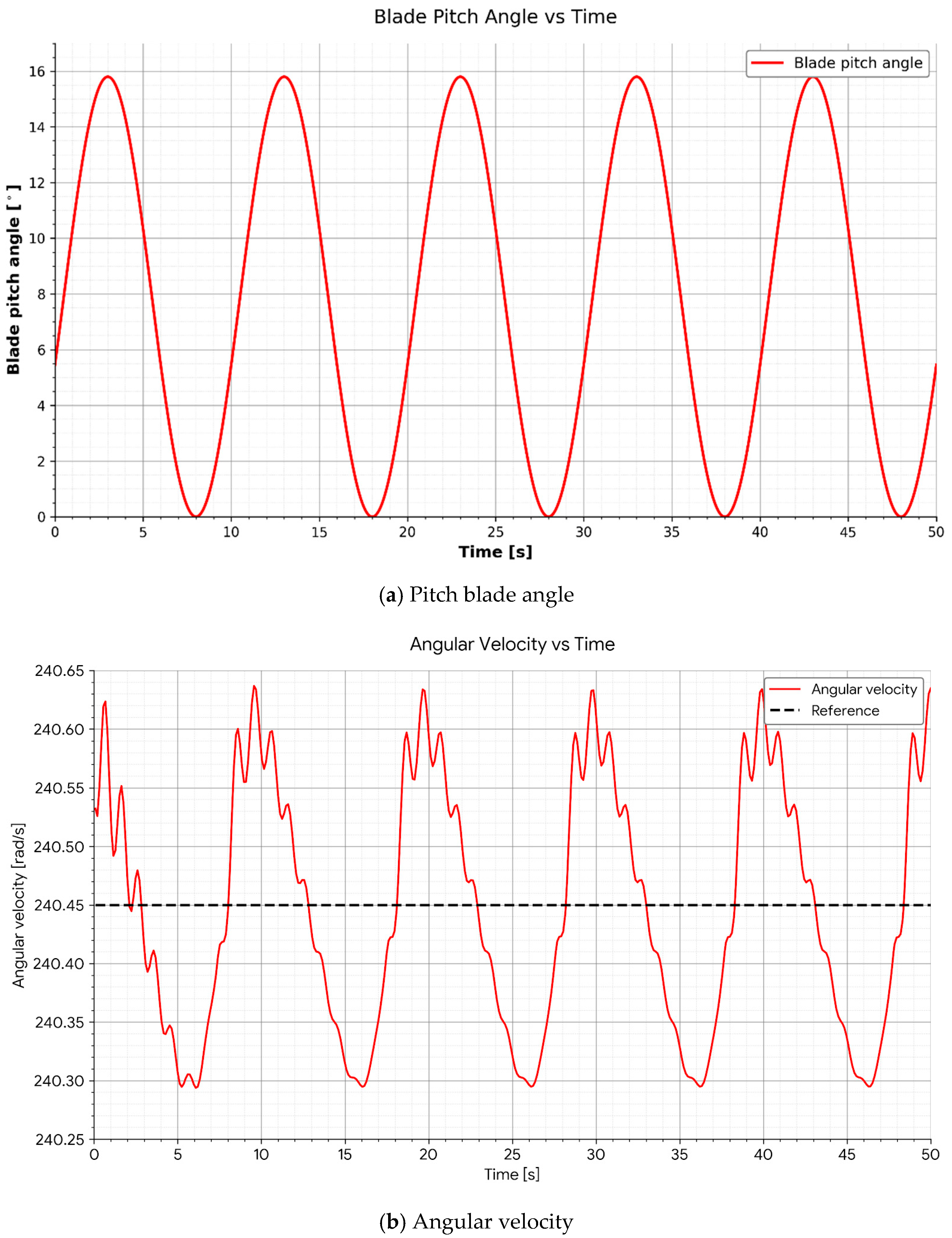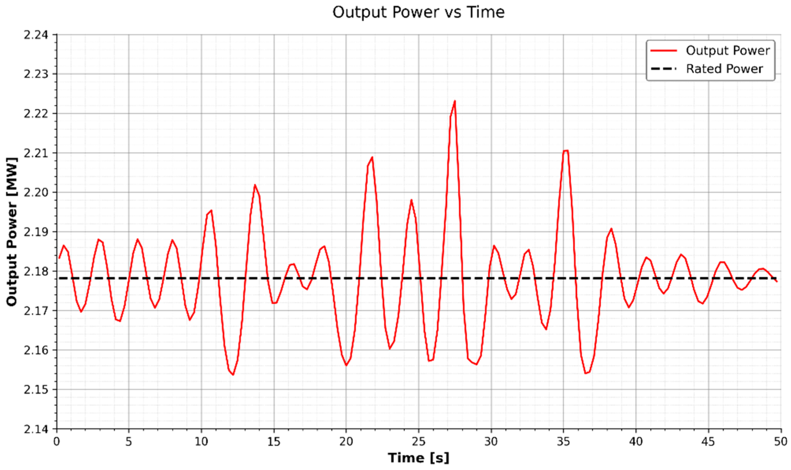 To quantify regulation performance, we compute the peak and root-mean-square (RMS) deviations of the rotor speed and output power. These metrics are calculated over the entire simulation window t ∈ [0, 50] s to capture both steady-state behavior and the controller’s response to initial transients. The metrics are defined as