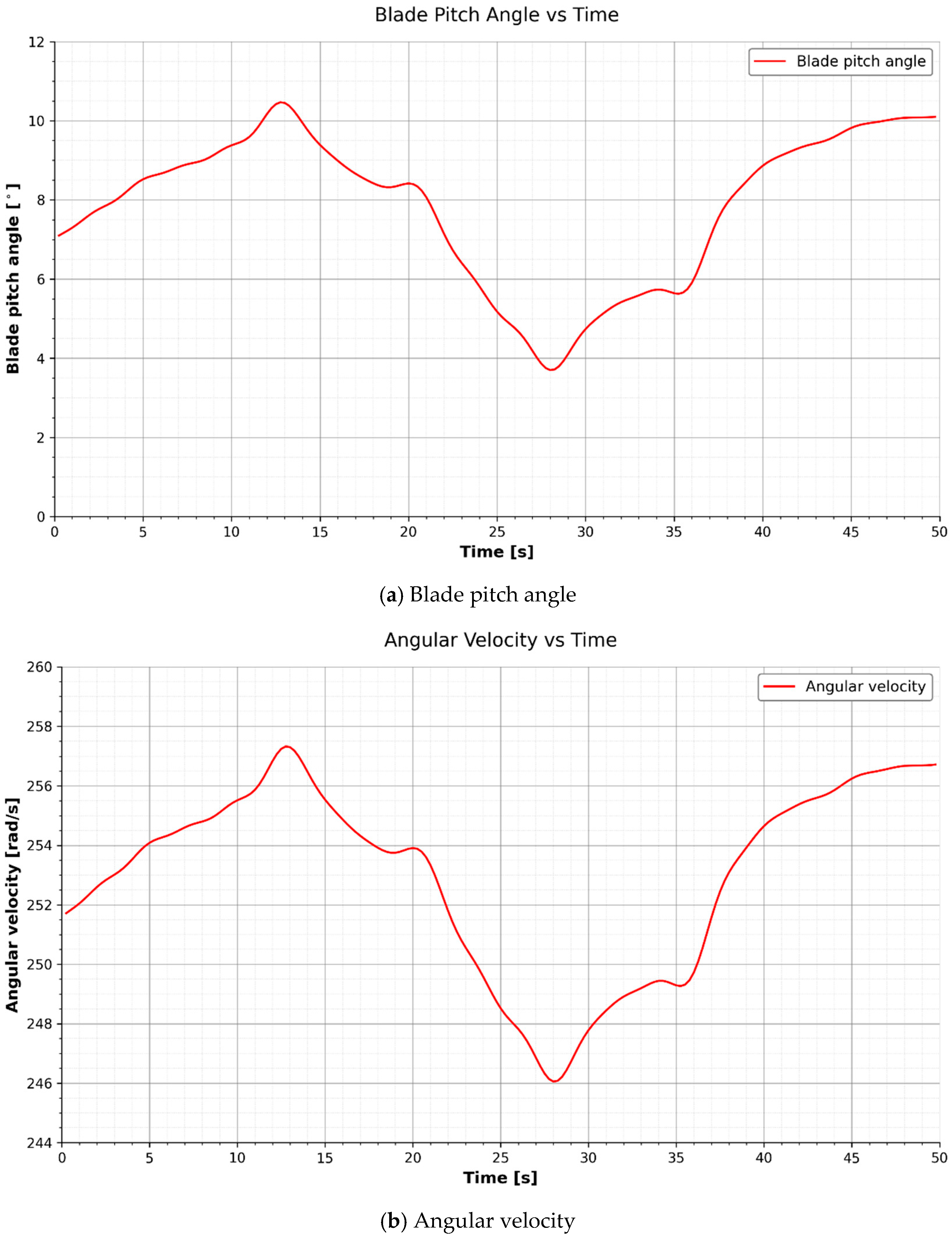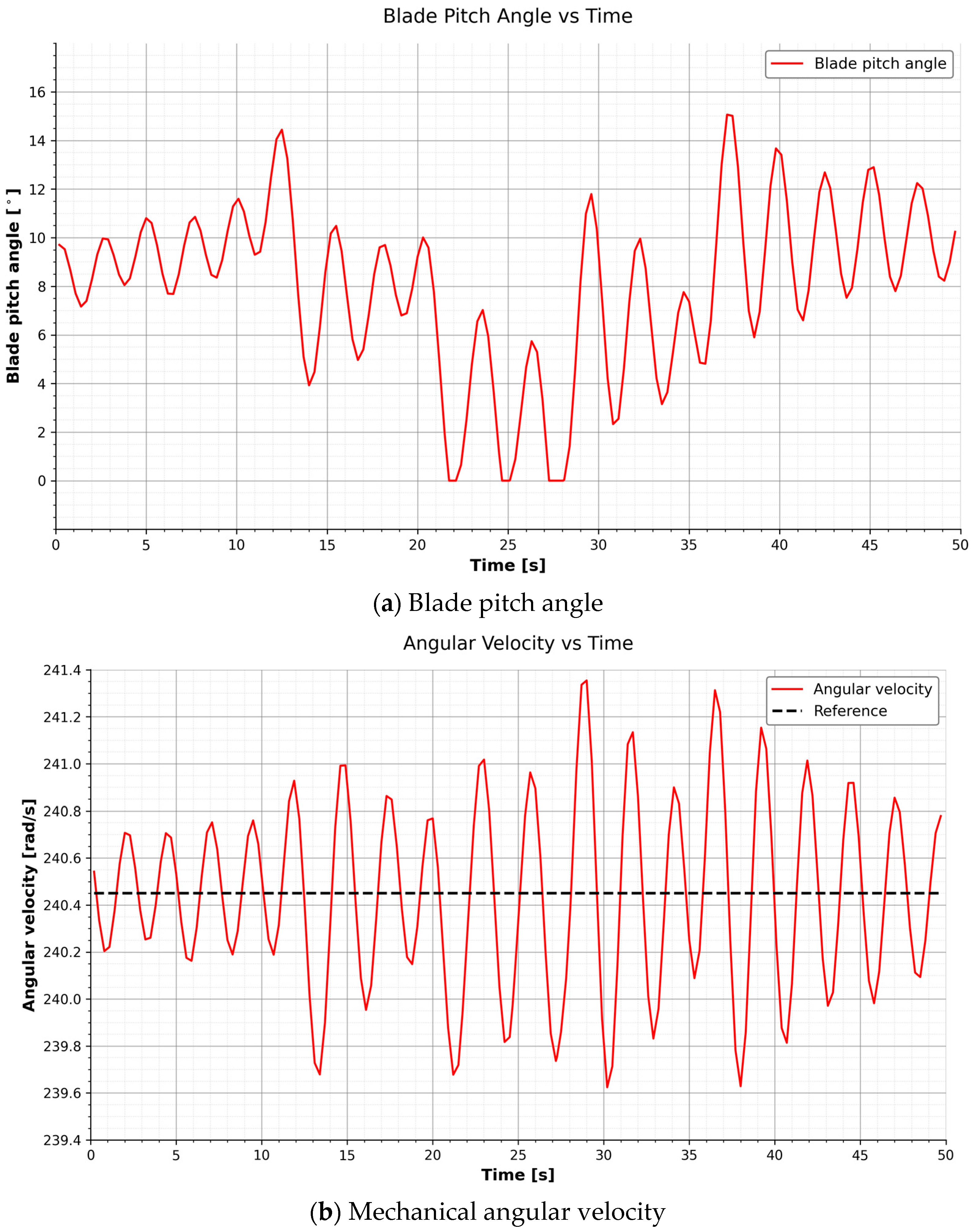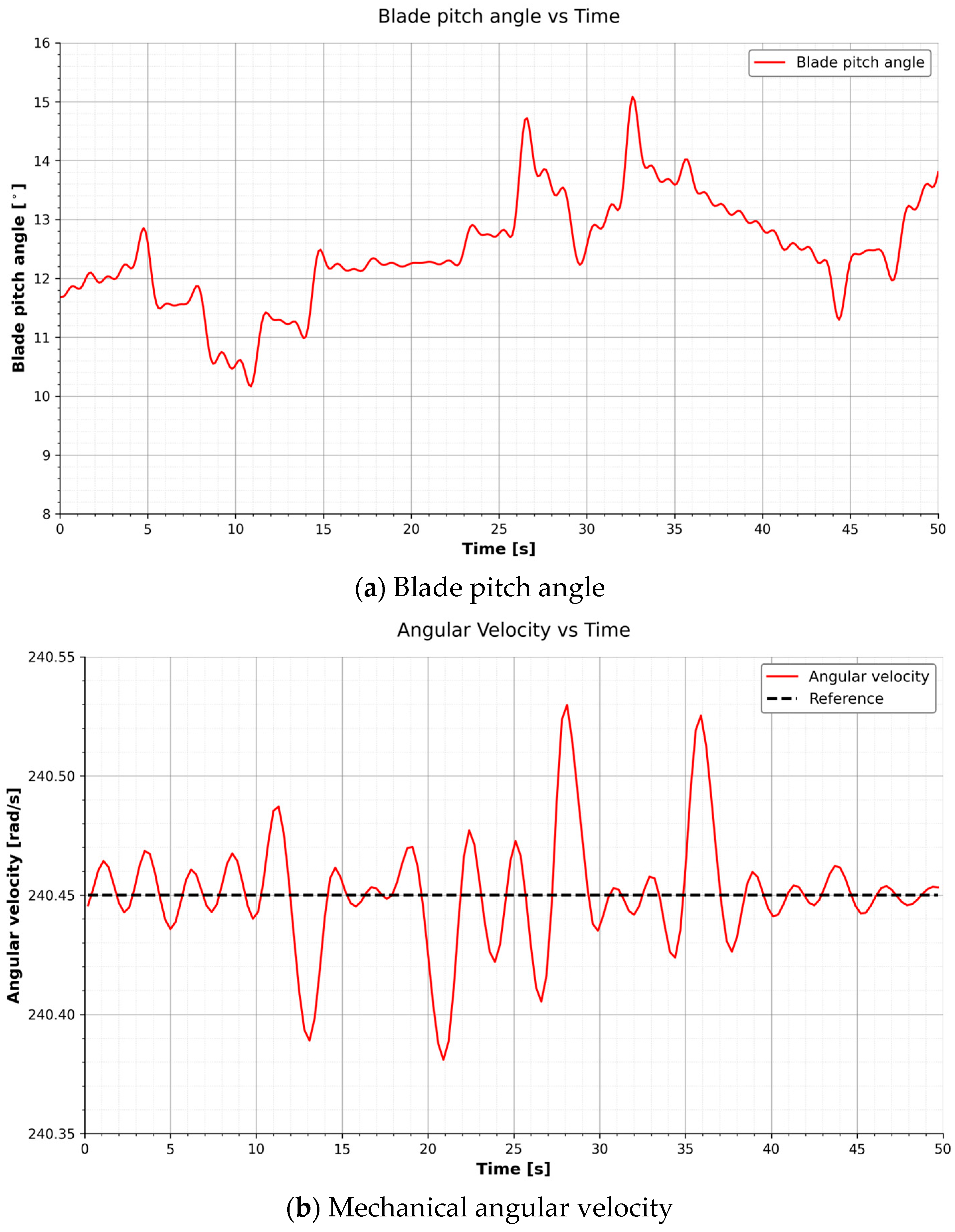 It is important to note that the 50 s simulation window serves as a short-horizon demonstration of the controller’s dynamic adaptation capabilities. While sufficient to observe the transient settling and immediate regulation improvement, a full statistical validation of fatigue loads and long-term robustness would require significantly longer durations (e.g., 10 min records per IEC standards) and multiple turbulence seeds. Consequently, the results below should be interpreted as a proof-of-concept for the adaptive mechanism’s stability.