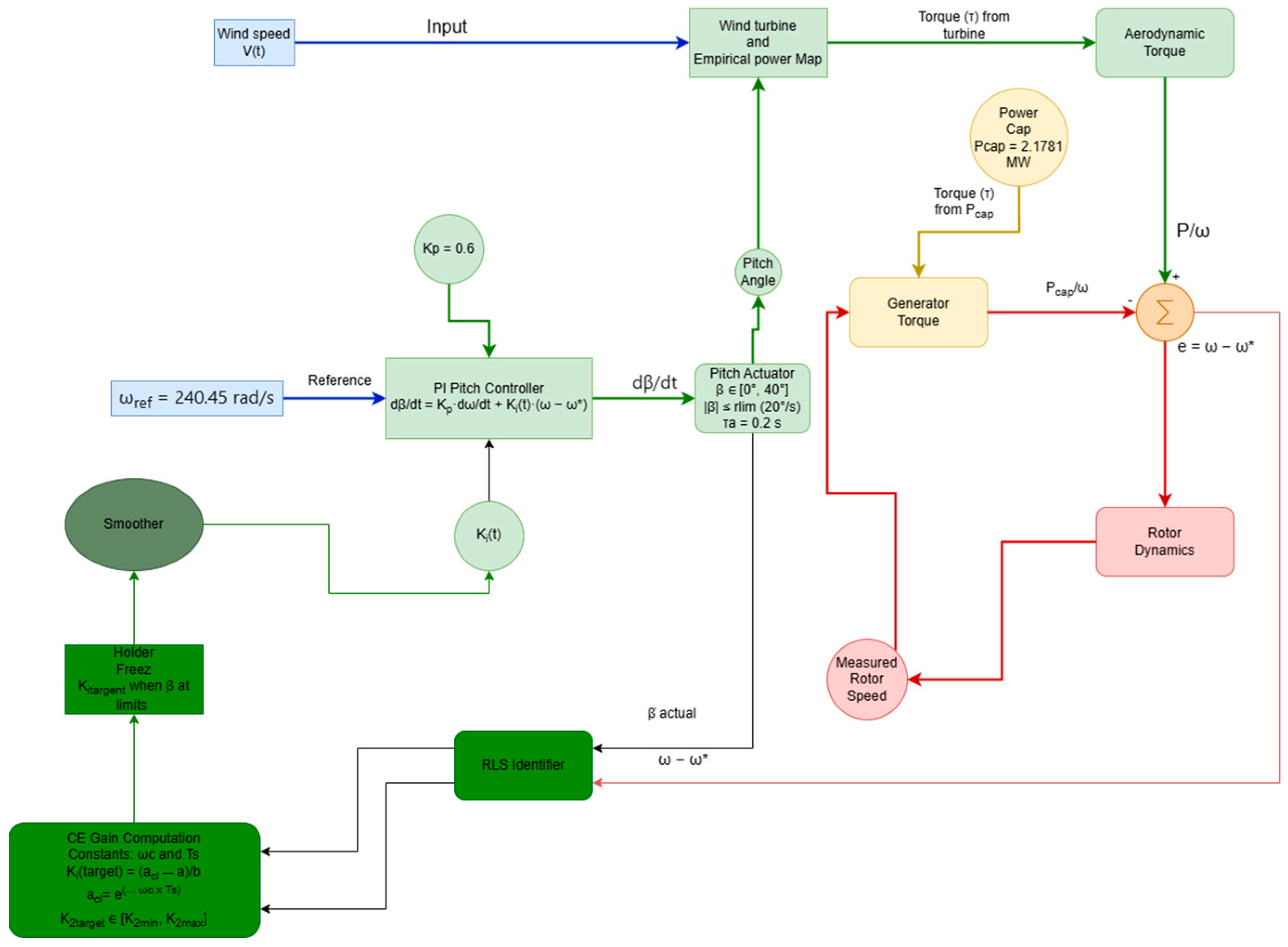 To clearly delimit the scope, this paper implements and validates the collective pitch regulation and adaptive integral tuning logic on a rigid-body turbine model. Broader concepts such as individual pitch control (IPC), grid-side converter variability, and long-term re-identification schedules are discussed to contextualize the method’s potential but are not simulated in this study.
