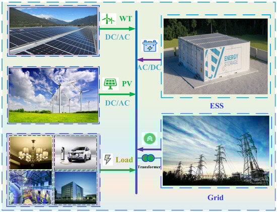 Figure 1. Schematic of power generation, transmission, distribution, and consumption in a WT−PV−ESS system.