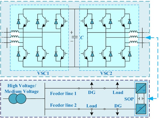 Under normal operating conditions, SOPs implement millisecond-level precise regulation of feeder power through fully controlled power electronic devices, effectively suppressing voltage violations and reducing network losses. This paper adopts SOPs with a B2B-VSC structure, deployed at the connection points of adjacent feeders to replace traditional mechanical section switches. Their topology and specific installation location are shown in Figure 2 [28].