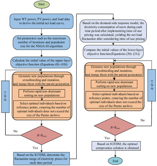 For upper-level optimization, this study integrates DR with the TOU mechanism, establishing a multi-objective optimization framework that synthetically accounts for net load fluctuation, user electricity purchase costs, and power consumption comfort. Through the introduction of a price elasticity matrix to characterize user response behavior to electricity price changes in different time periods, the peak–valley electricity price levels are dynamically adjusted to guide users in reasonably shifting electricity loads, thereby effectively smoothing the sharp changes in net load caused by renewable energy output fluctuation. It is worth noting that the DR mechanism adopted in this study formulates TOU tariffs on the basis of day-ahead load forecasts as well as wind and photovoltaic power generation prediction data. Specifically, the demarcation of TOU periods into peak, flat, and valley intervals, together with their corresponding electricity price levels, is predefined and formally promulgated to end-users in advance. With access to these pre-announced tariff signals, consumers adjust their power consumption schedules for the subsequent day accordingly. Thus, this mechanism is explicitly categorized as a day-ahead time-of-use pricing scheme.