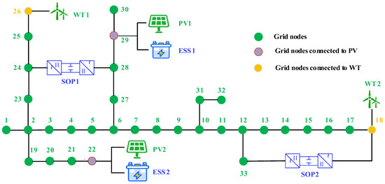 Driven by the “dual carbon” goal, the power system is rapidly evolving towards a cleaner, low-carbon, and more efficient structure, with the grid-connected proportion of renewable energy such as photovoltaic (PV) and wind turbine (WT) continuously rising [1,2,3]. However, the strong volatility and uncertainty of renewable energy output have placed unprecedented pressure on traditional distribution networks in terms of scheduling flexibility and power supply reliability [4,5]. Consequently, active distribution networks (ADNs) have emerged as a research focus. Their core objective is to enhance the grid’s adaptability to high-penetration renewable energy and achieve source–grid–load–storage coordinated optimization via energy storage systems (ESSs) [6], soft open points (SOPs) [7], and demand response (DR) [8,9].