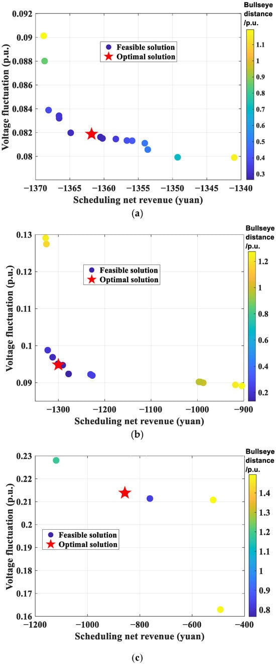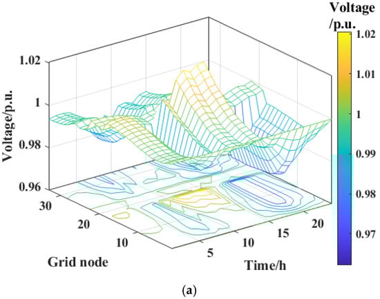 As shown in Figure 10a, before optimization, the system voltage range is wide (0.962–1.021 p.u.). Some nodes face the risk of voltage violation (>1.03 p.u.) during 10:00–14:00 due to high PV penetration, while undervoltage (<0.97 p.u.) occurs in load-concentrated areas during 16:00–22:00. After scheduling optimization, as shown in Figure 10b, the voltage fluctuation range is narrowed to 0.979–1.007 p.u., the voltage deviation is reduced from 0.254 p.u. to 0.082 p.u. (a reduction of 67.7%), and all node voltages are strictly constrained within the allowable limits. This result highlights the improvement effect of scheduling optimization on voltage quality.