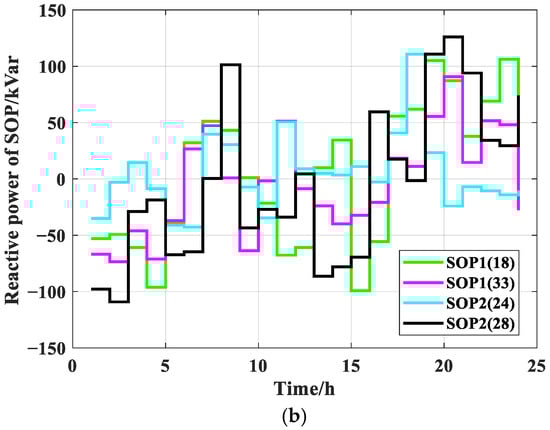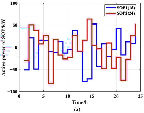 Figure 9 shows the power output changes in SOPs within 24 h. It can be seen from that SOPs can dynamically adjust power to achieve the optimal spatial distribution of power flow. This regulation mechanism balances the power of different nodes, effectively reducing system network losses and voltage fluctuations. To a certain extent, it remedies the shortcomings of ESS that cannot be adjusted due to capacity and mobility, thereby improving the overall operational efficiency of the system.