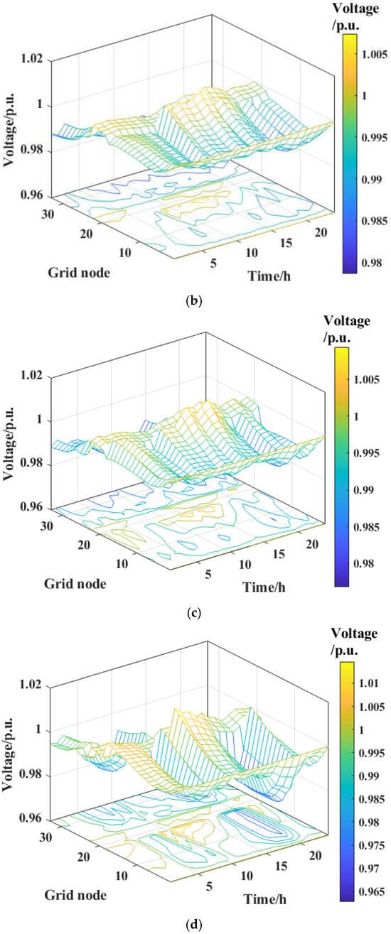 Figure 10. Comparison of node voltages after optimization with different algorithms: (a) before optimization; (b) NSGA-III; (c) MOPSO; (d) MOCGO.