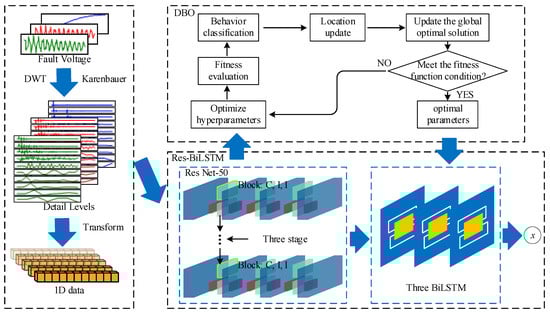A fault-location model based on the DBO-optimized Residual Bidirectional Long Short-Term Memory (DRB) neural network is constructed. Through normalization, all data are given equal importance in the DRB. The input layer is set with 11 neurons, and the output layer with 1 neuron. During the initialization of the DRB parameters, the maximum iteration number of DBO is set to 20, the population is randomly initialized, and each individual contains three-dimensional position parameters. Each hyperparameter combination is trained for 25 epochs to complete the DRB training. After DBO optimization, the final optimal parameters are determined as: learning rate: 0.000086; batch size: 16; LSTM hidden-layer dimension: 1024. This optimization process takes approximately 4.5 h on an Intel Core i7-12700 and NVIDIA RTX 3060 platform, achieving an efficiency improvement of about 40% compared to grid search. Sensitivity analysis shows that the model is most sensitive to the learning rate—a one-order deviation from the optimum can increase RMSE by 15–30%, while it exhibits good robustness to changes in batch size and hidden-layer dimension, with RMSE fluctuations below 5%. The optimized model can be deployed in actual devices, with online inference in milliseconds, meeting the real-time requirements of engineering applications.