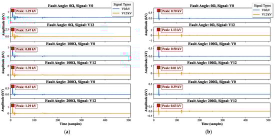 According to Equations (9) and (16), the amplitude ratio of the sum of 1-mode and 2-mode components to the 0-mode component at the fault point is independent of the fault inception angle. To verify this inference, fault points with different inception angles are set at a distance of 50 km from the line head for simulation validation. For a single-phase ground fault, as shown in Figure 5a, different fault inception angles cause the wavelet modal maxima of V12 and V0 to vary, but the ratio of the wavelet modal maxima remains identical. This confirms that the fault inception angle does not affect the amplitude ratio of the sum of 1-mode and 2-mode components to the 0-mode component in the case of a single-phase ground fault.