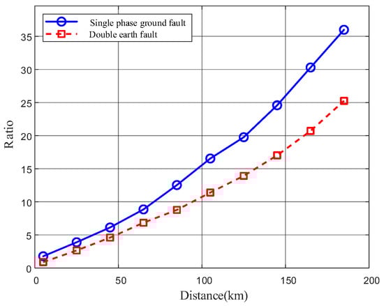 As indicated by Equations (11) and (19), once the AC transmission line is specified, its surge impedance and attenuation coefficient become fixed values. Therefore, there exists a corresponding relationship between the distance x from the fault point to the measurement point at the line head and the amplitude ratio of the sum of 1-mode and 2-mode components to the 0-mode component of the voltage at the fault point. To explore this relationship, asymmetric fault points are set along a 200 km AC transmission line, starting from 5 km away from the measurement point with a simulation step of 20 km, covering a range from 5 km to 185 km. This setup is used to investigate how the distance x relates to the amplitude ratio of the sum of the voltage 1-mode and 2-mode components to the 0-mode component at the fault point.