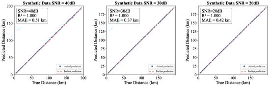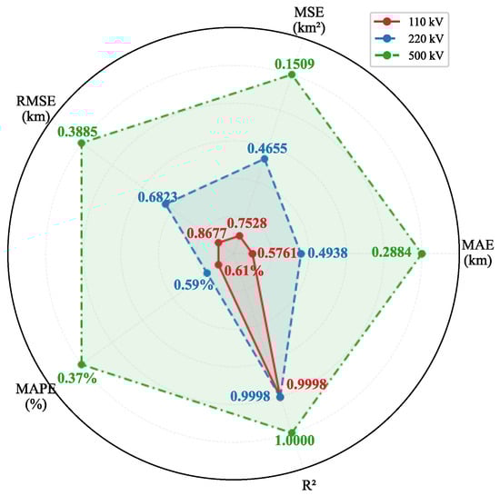 As shown in Figure 8, as noise levels increase, prediction accuracy decreases slightly, but the MAE remains below 0.6 km at 40 dB. This demonstrates the DRB’s robust interference resistance. To examine the performance of the DRB network under varying data acquisition precision levels, a comparative experiment across multiple sampling frequencies was conducted. Three representative frequencies were selected: 1 MHz, 700 kHz, and 400 kHz, simulating application scenarios ranging from precision monitoring to cost-effective monitoring. All tests were performed under the same 220 kV transmission system simulation model and a fixed noise level to ensure controlled variables. The results are shown in Table 3.