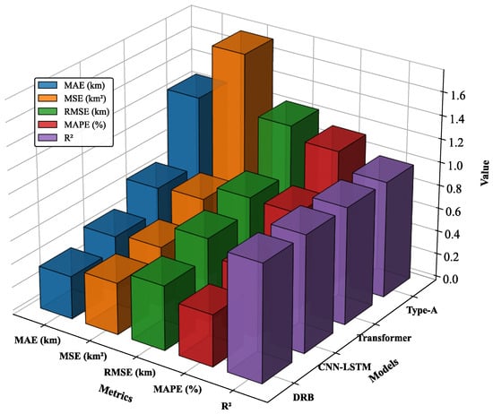 As shown in Figure 9 and Table 5, The systematic evaluation in this study demonstrates that among the four predictive models (DRB, CNN-LSTM, Transformer, and Type-A), the proposed DRB model achieves the best overall performance. It obtains the minimum values across all error metrics (MAE: 0.3648; MSE: 0.4396; RMSE: 0.5489; MAPE: 0.4403%) and the highest coefficient of determination R2 of 0.9999, reflecting its superior prediction accuracy, stability, and goodness-of-fit. The CNN-LSTM and Transformer models perform comparably and significantly outperform the conventional baseline model Type-A, confirming the effectiveness of deep hybrid architectures and attention mechanisms for the present task. In contrast, the Type-A model shows clear gaps across all metrics, highlighting the necessity of adopting advanced model architectures.