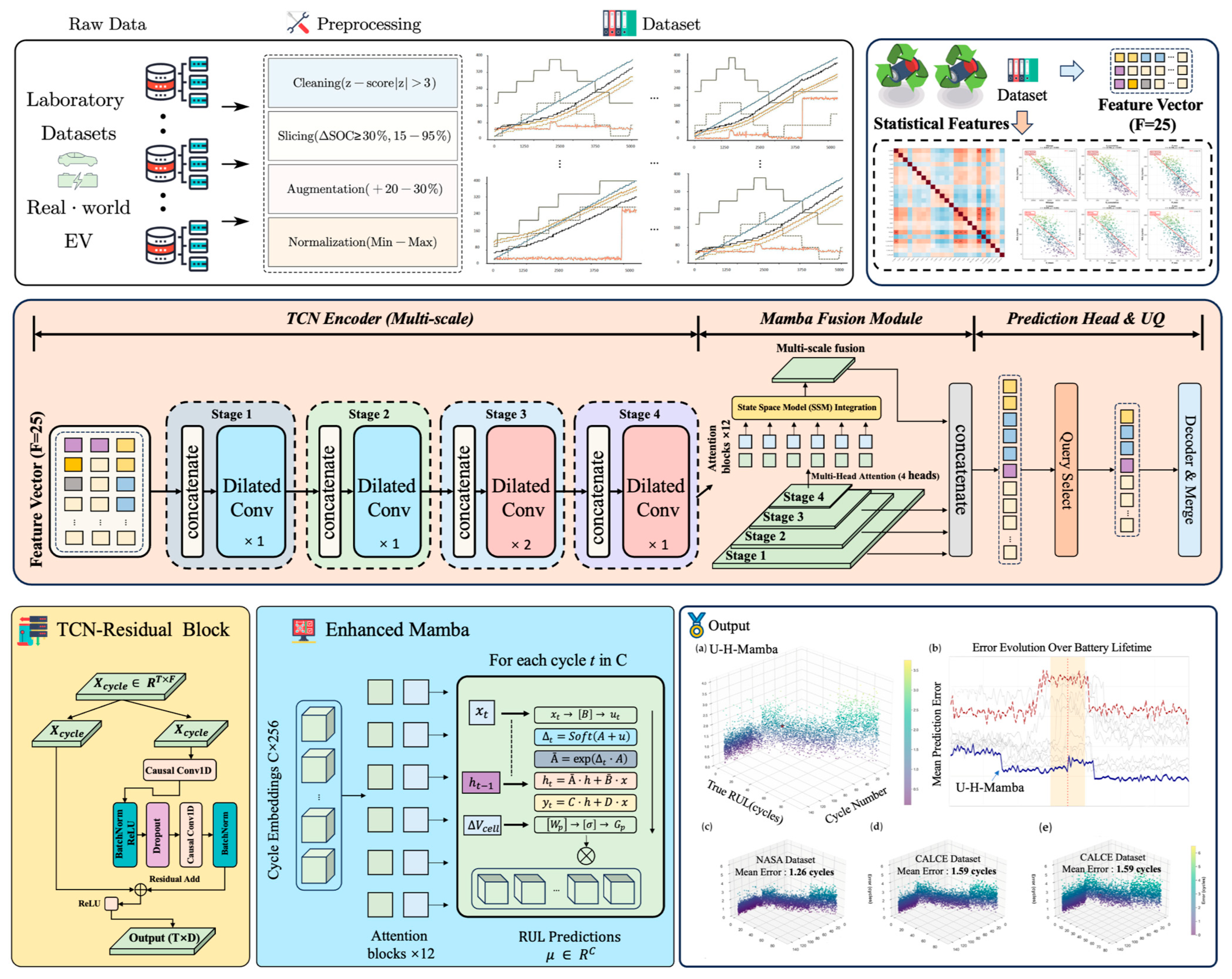 - An innovative two-stage architecture is introduced, which first uses a TCN to extract robust, low-dimensional “fingerprints” from each cycle. A Mamba model then captures the long-range dependencies between these abstract fingerprints, ensuring high computational efficiency suitable for resource-constrained devices.