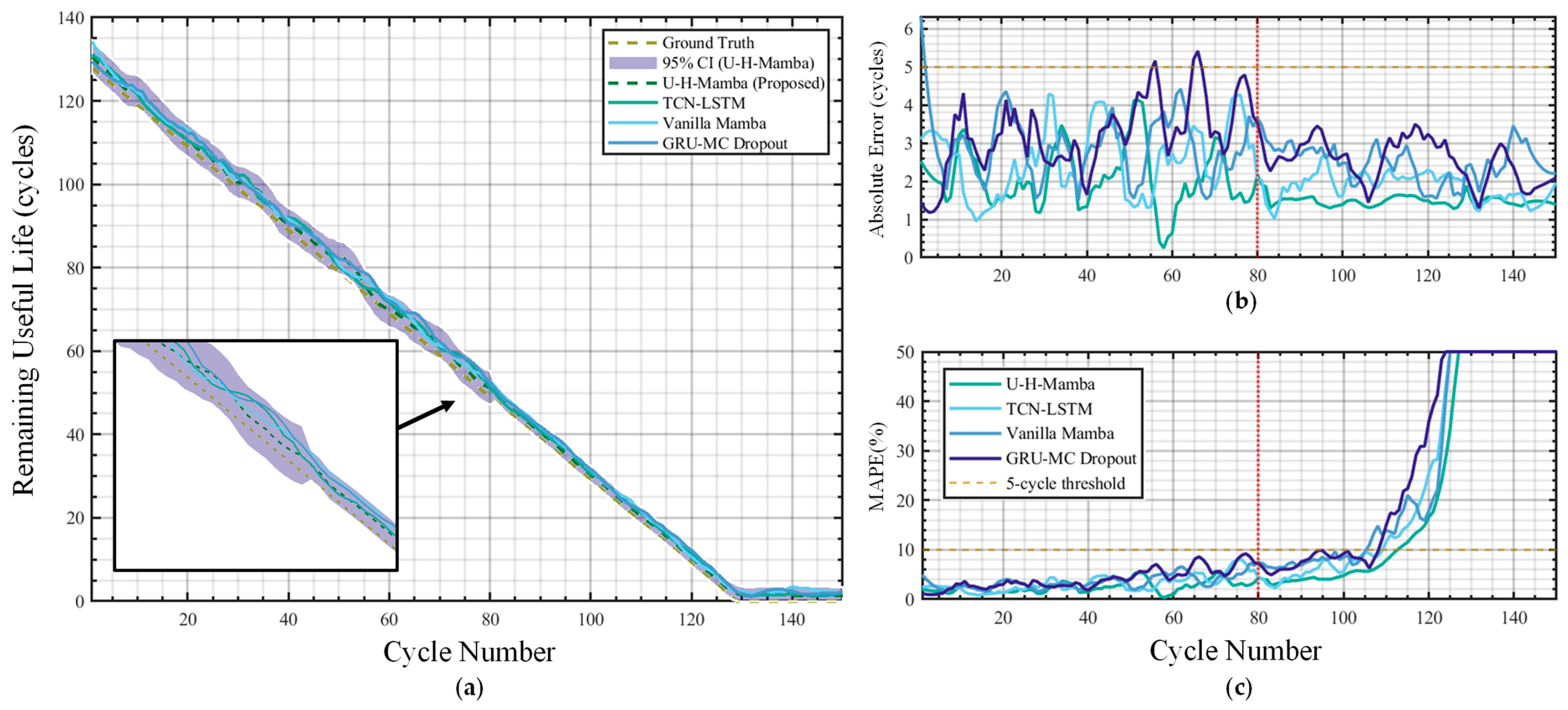 Chicago/Turabian StyleWen, Zhihong, Xiangpeng Liu, Wenshu Niu, Hui Zhang, and Yuhua Cheng. 2026. "U-H-Mamba: An Uncertainty-Aware Hierarchical State-Space Model for Lithium-Ion Battery Remaining Useful Life Prediction Using Hybrid Laboratory and Real-World Datasets" Energies 19, no. 2: 414. https://doi.org/10.3390/en19020414