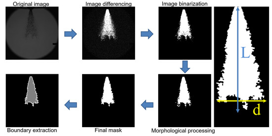 The spray parameters were extracted from the schlieren images using custom-written MATLAB code (MATLAB R2023a, MathWorks), as shown in Figure 2. The atomization images were binarized using a dynamic threshold segmentation technique, and the optimal segmentation threshold was automatically determined using the Otsu algorithm to perform edge feature extraction [23]. This threshold selection strategy is based on the principle of maximizing inter-class variance and can effectively distinguish the spray region from the background area. Its reliability has been validated in multiple studies on spray characterization [24] and is a key preprocessing step for extracting spray parameters from images. After binarization, the spray boundary was further processed to obtain the spray parameters. Spray parameters such as spray penetration distance (L), spray cone angle (θ), and spray area were calculated. To ensure consistency when comparing spray penetration lengths under different conditions, the penetration length was defined as the vertical distance from the nozzle orifice to the farthest downstream spray edge. The spray width (d) was defined as the distance between the leftmost and rightmost edges of the spray. The spray area and cone angle were calculated as: , . For the processing of droplet diameter data, we select droplets with deep color, clear edges, and within the imaging depth of field range as the objects. A deep-learning-based super-resolution method was applied to enhance the image and improve the recognition of small-diameter droplets. The enhanced image was then binarized to extract the droplets within the imaging depth of field. To quantify the uncertainty introduced by the image processing procedure, a threshold sensitivity analysis was performed. The segmentation threshold was varied within ±5% of the nominal value, and the resulting variations in key spray parameters were evaluated. The changes in spray penetration length, mean diameter of droplets and cone angle were found to be within ±1 mm, ±0.003 mm and ±0.5°, respectively, and these values were taken as the image-processing uncertainty.