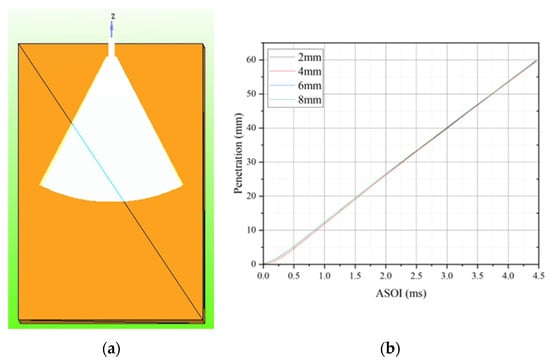 The study used CONVERGE for three-dimensional transient spray simulations, and the geometric model is shown in Figure 3a. This software adopts the Euler–Lagrange framework, in which the continuous phase is described by solving the compressible Navier–Stokes equation, and the discrete phase droplets are solved by the particle tracking model. A structured mesh was used with adaptive local refinement. Mesh independence was verified for different mesh sizes, and the results are shown in Figure 3b. For grids of different sizes, we conducted grid independence verification. The results are shown in Figure 3b. When the grid size changed from 4 mm to 2 mm, the difference was only 0.16%. Therefore, the final selected base grid size was 4 mm, and the size near the nozzles was refined to 0.5 mm. The simulation models are listed in Table 3. Droplets were assumed to be spherical, and methanol was treated as a single-component fuel. Droplet evaporation was modeled as a convection-controlled process using the Frossling correlation [25], assuming uniform droplet temperature. Chemical reactions were neglected, and the simulations focused on non-reacting spray behavior. The ambient nitrogen was treated as an ideal gas. Spray–wall interaction was described using a wall-film model [26], assuming smooth walls and thin liquid films. Turbulence was modeled using the RNG k–ε model [27], which provides a Reynolds-averaged closure suitable for engine-relevant spray flows. Primary/secondary breakup was modeled using the KH–RT breakup model [28], which combines Kelvin–Helmholtz and Rayleigh–Taylor instabilities and has been extensively used and validated for high-pressure and vaporizing sprays in engine-relevant environments. Droplet collision and coalescence were modeled using the No-Time-Counter (NTC) method [29], a standard collision algorithm for Lagrangian spray simulations.