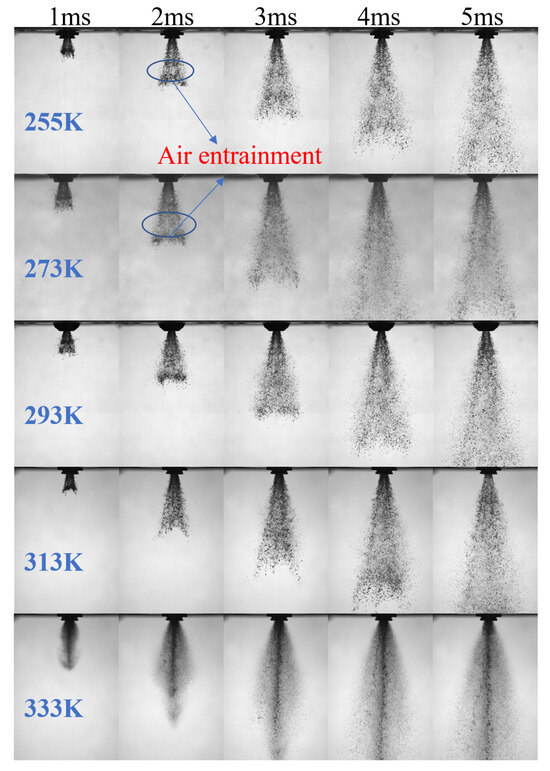 The spray area reflects the degree of spatial utilization of the surrounding environment by the spray. As shown in Figure 5c, the spray area remained nearly constant within the temperature range of 273–313 K, owing to the non-synchronous variation between the spray cone angle and penetration length. Due to the rapid movement of the spray outside the viewing window range at 333 K, the spray area in the later stage was lower than that when the temperature was between 273 and 313 K.