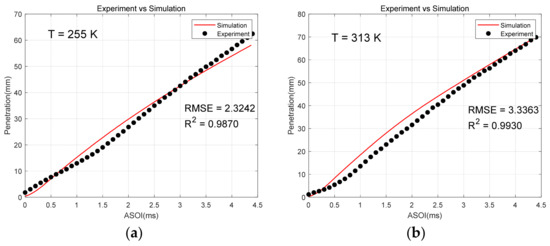 Comparison between simulation and experiment. (a) T = 255 K; (b) T = 313 K.