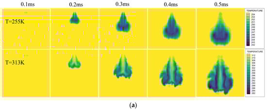 Since the influence of injection pulse width on spray morphology is relatively minor, this section focuses on analyzing the spray characteristics under different injection pressures, using an ambient temperature of 255 K as the comparison condition, as shown in Figure 13. At an injection pressure of 0.4 MPa, the cooling core forms slowly and remains relatively concentrated, with a minimum temperature of approximately 242 K, primarily confined to the region directly beneath the nozzle. The cooling zone exhibits a well-defined and symmetric shape, indicating that the evaporation process is strongly constrained, with latent heat absorption localized within the liquid column core and limited vapor-phase expansion. This observation aligns well with the experimental finding of a clear liquid column and weak atomization under low-pressure conditions. When the injection pressure is increased to 0.6 MPa, the cooling core expands rapidly—within approximately 0.3 ms after injection—and extends toward the spray front. The minimum temperature further decreases to 241 K, and the area of the cooling region increases substantially, indicating a more vigorous evaporation process. The higher injection momentum enhances gas–liquid interfacial disturbances, leading to a significant increase in the droplet surface area, thereby intensifying the evaporative cooling effect. The temperature field results demonstrate that as the injection pressure rises, both droplet kinetic energy and turbulent intensity increase simultaneously. The entrainment effect is markedly strengthened, and both heat transfer and evaporation rate are accelerated. Consequently, the spray morphology transitions from a concentrated liquid column to a dispersed plume, reflecting a shift from momentum-limited to turbulence-enhanced atomization behavior.