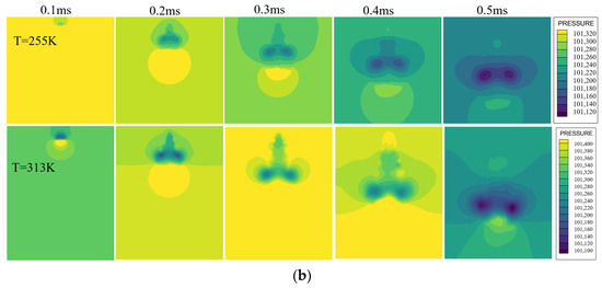 Temperature and pressure fields during spray development at 255 K and 313 K: (a) temperature field; (b) pressure field.