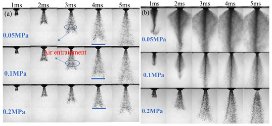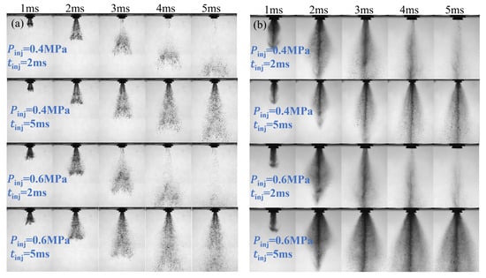 Table 2 lists the experimental conditions. These conditions are close to cold-start operating environments. Meanwhile, the influence of the injection strategy on the spray characteristics was also studied with injection pulse widths and the injection pressures. In this experiment, the uncertainty mainly stemmed from fluctuations in ambient conditions during testing, as well as from parameter extraction and data processing. Therefore, during the experiment, each condition was tested six times to ensure that the changes in temperature and pressure were within ±1 K and ±5%, respectively. When extracting spray parameters using image processing techniques, background subtraction combined with edge enhancement was applied to improve the stability of the results. Finally, the average value was used as the reported result, and the experimental uncertainties were represented using error bars, which are also shown in the results.