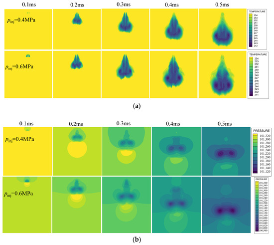 Temperature and pressure fields during spray development under different ambient pressures. (a) Temperature field; (b) pressure field.