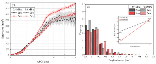 Effects of injection strategies on methanol spray characteristics at 333 K: (a) spray penetration, (b) spray cone angle, (c) spray area, and (d) droplet size distribution.