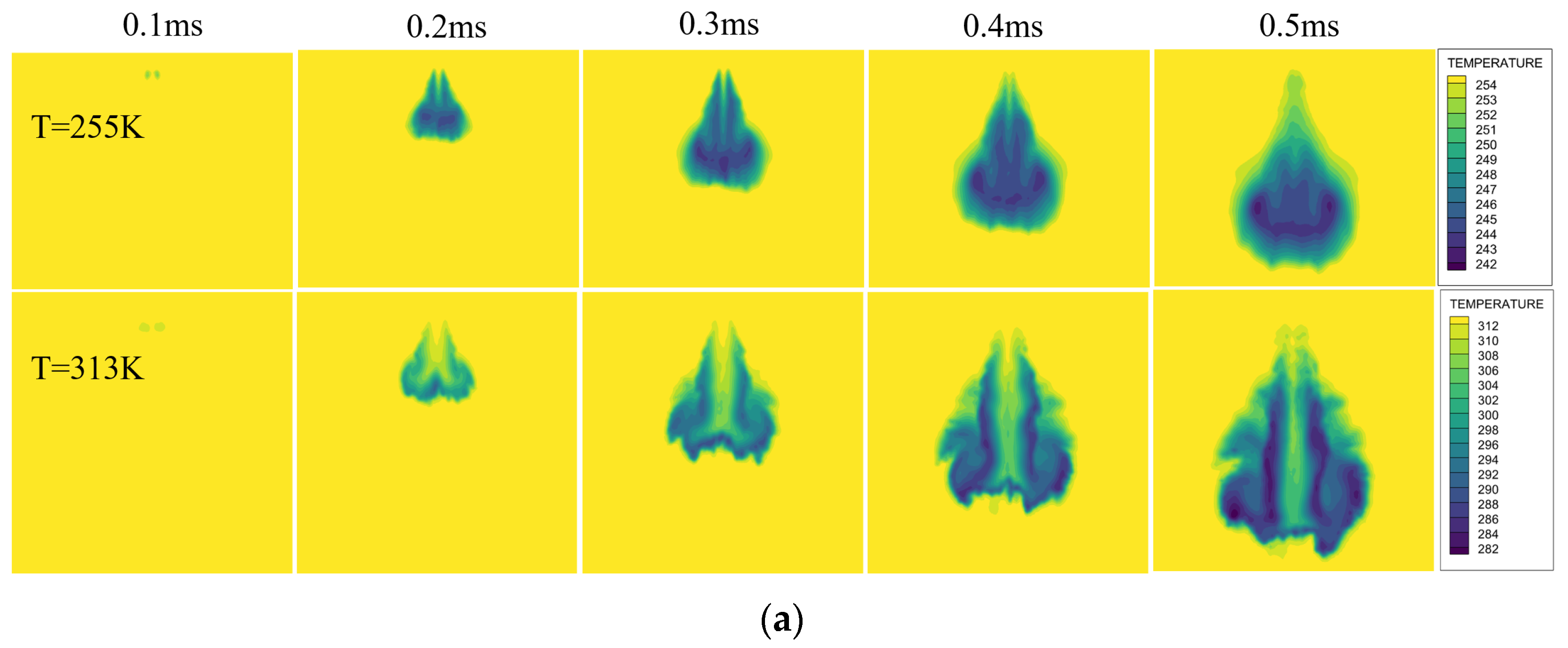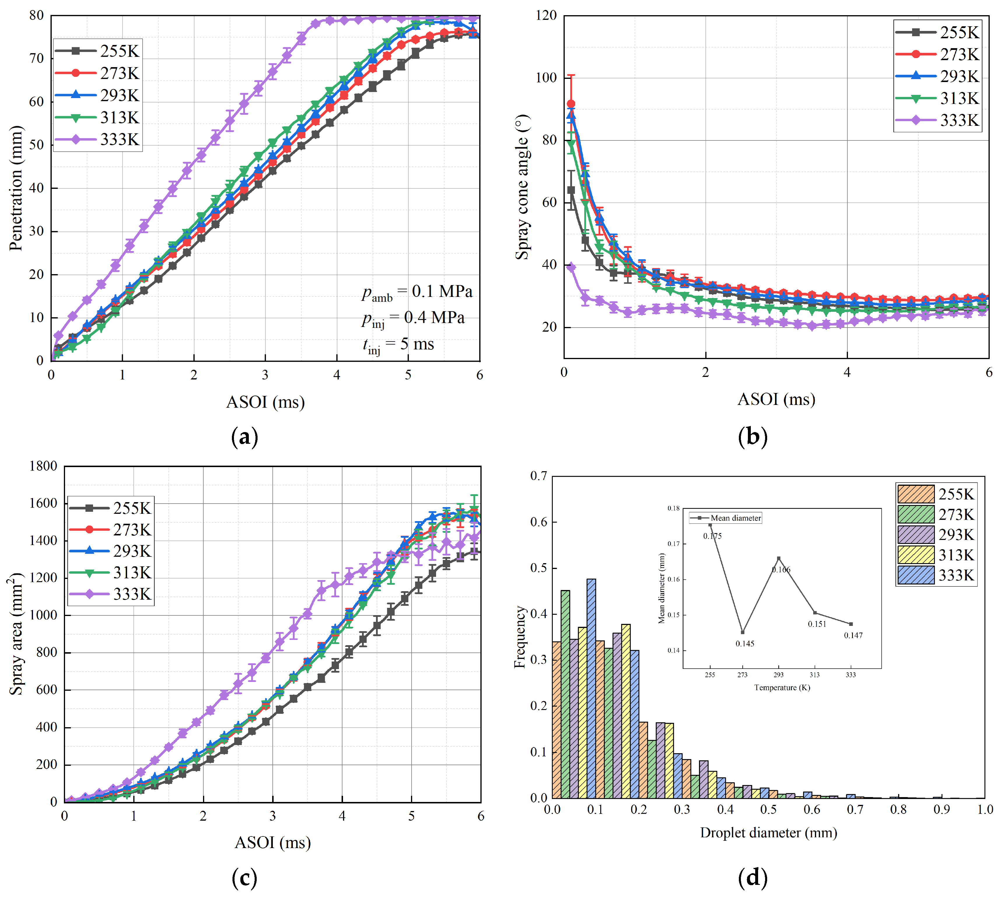 3.1. The Influence of Temperature on Spray Morphology and Parameters