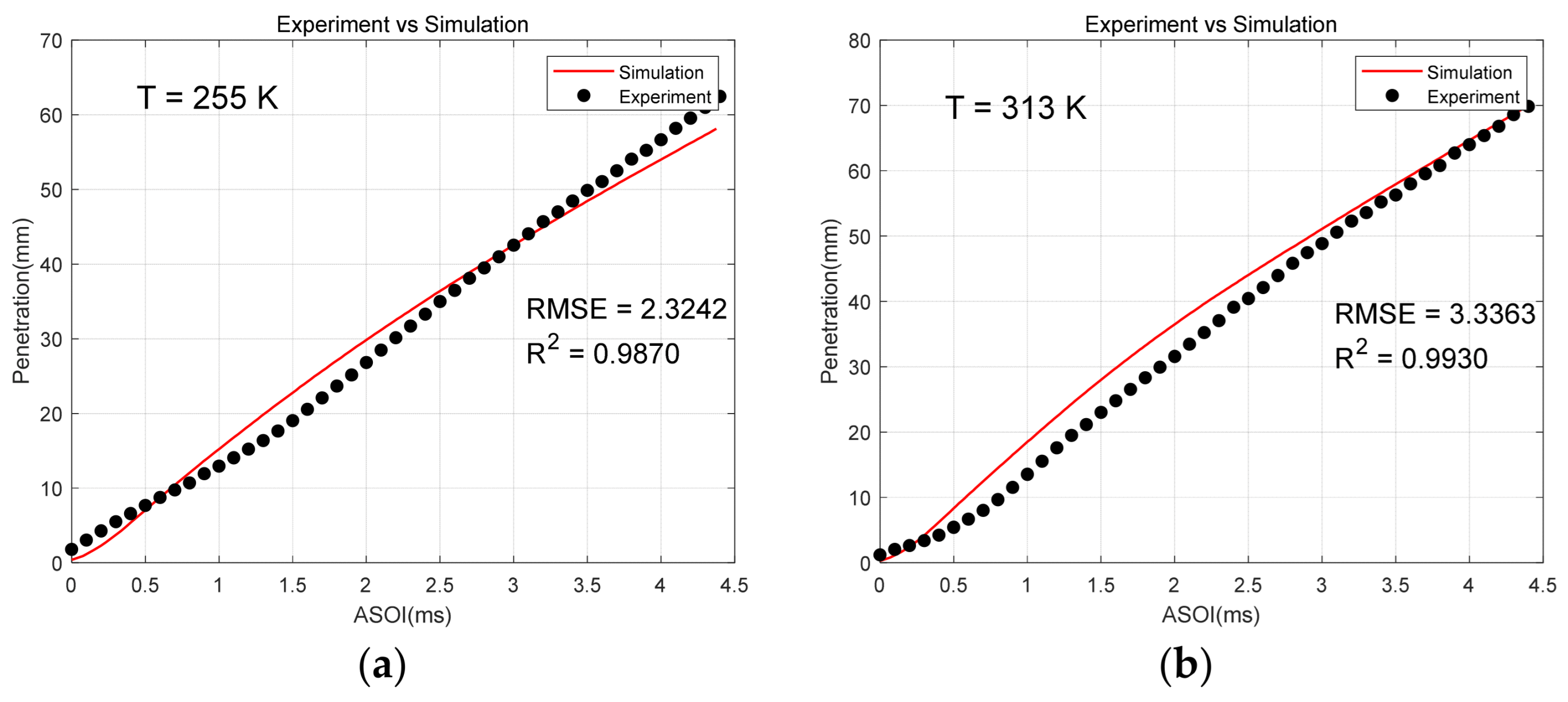 - Leng, X.; Xing, M.; Luo, Z.; Jin, Y.; He, Z.; Wei, S. An investigation on methanol high pressure spray characteristics and their predictive models. Energy 2024, 313, 133732. [Google Scholar] [CrossRef]