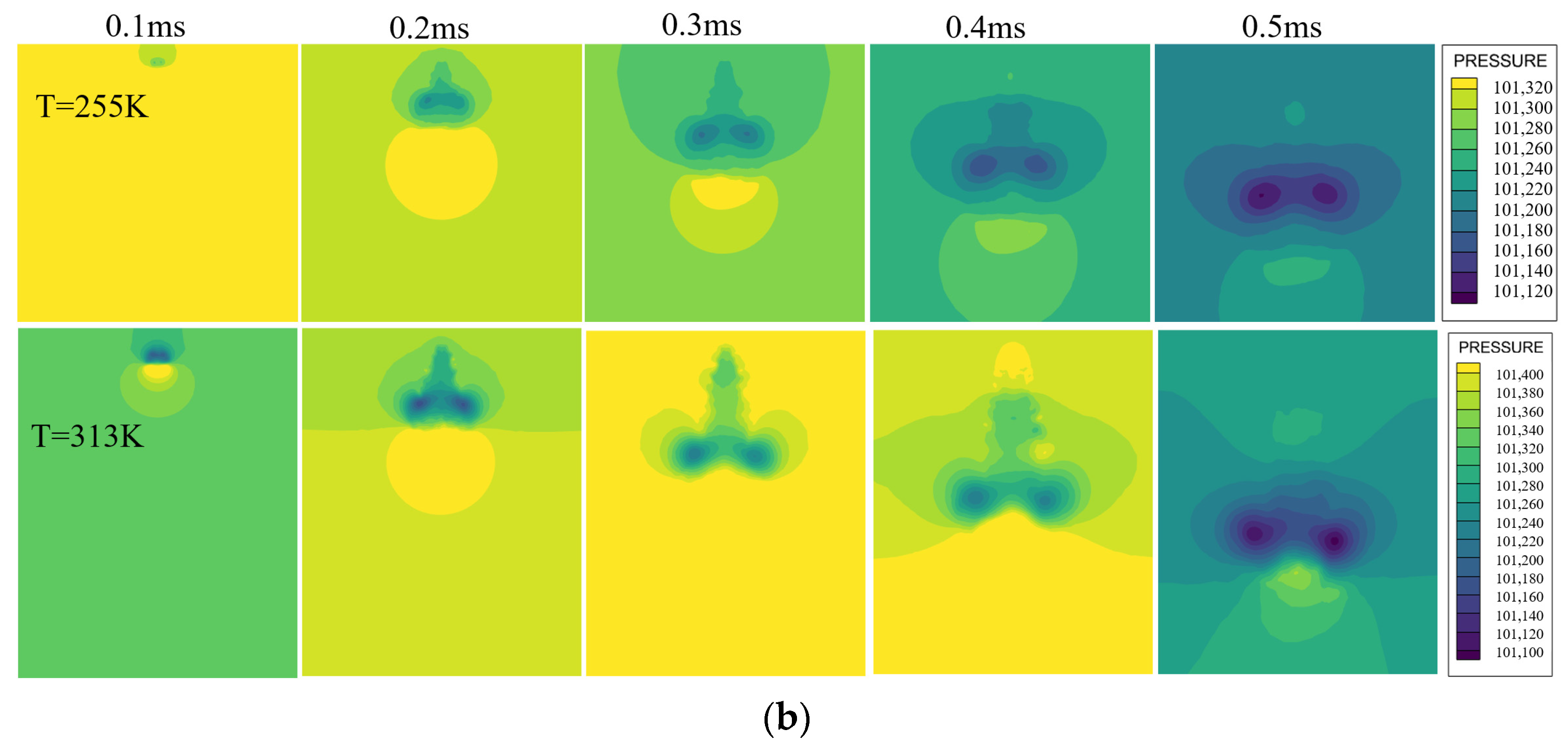 - Spray atomization and evaporation are strongly influenced by ambient temperature. As the temperature increases from 255 K to 333 K, the spray penetration length increases by approximately 70%, accompanied by significant enhancement in evaporation. Under low-temperature conditions, a persistent cooling core forms with a dense liquid core and long penetration distance, which inhibits vaporization and delays mixture formation—this constitutes the fundamental thermodynamic cause of cold-start difficulty. At higher temperatures, localized flash boiling occurs, markedly accelerating atomization and evaporation; the cooling core rapidly dissipates, resulting in a more uniform combustible mixture. However, when the temperature exceeds 313 K, excessive penetration increases the risk of wall impingement and pre-ignition.