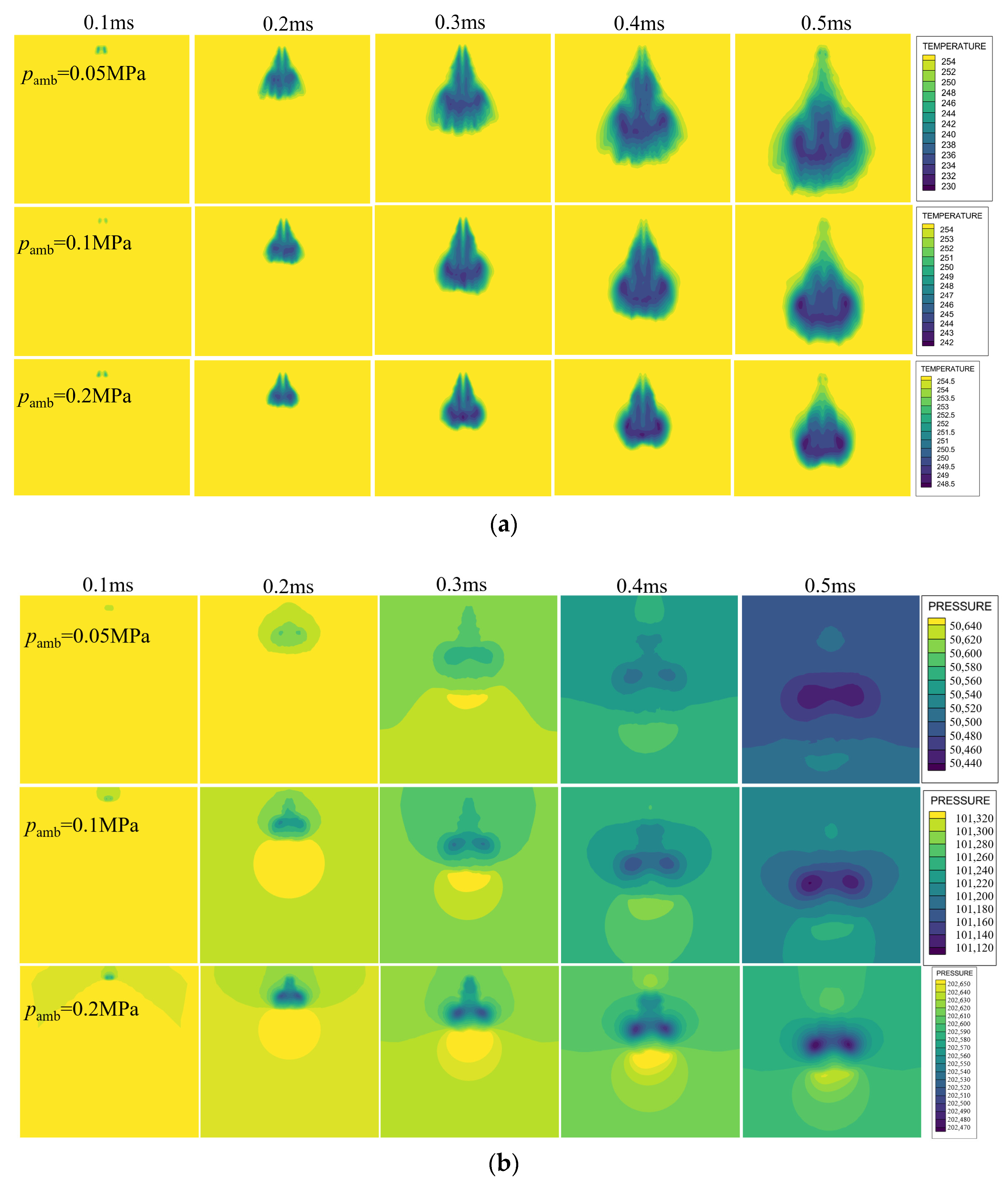 3.2. The Influence of Environmental Pressure on Spray Morphology and Parameters