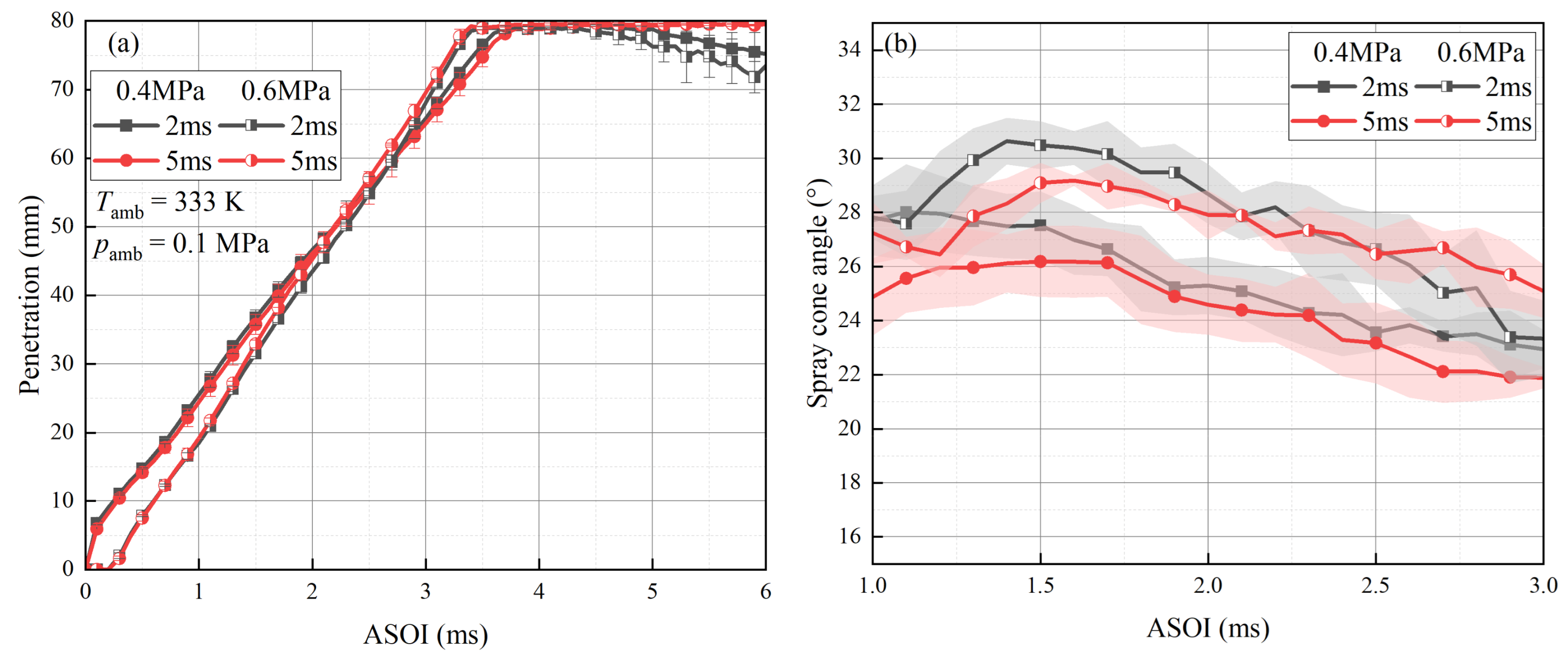 - Ambient pressure governs spray dynamics through the gas–liquid momentum ratio. Ambient pressure significantly affects the macroscopic behavior of low-pressure methanol sprays. Increasing ambient pressure reduces both spray velocity and penetration length due to the smaller pressure differential between the injection and ambient pressures. Meanwhile, the higher gas density enhances interaction between the spray and surrounding air, leading to a wider spray cone angle. In addition, droplet size increases with rising ambient pressure, reflecting reduced atomization efficiency.