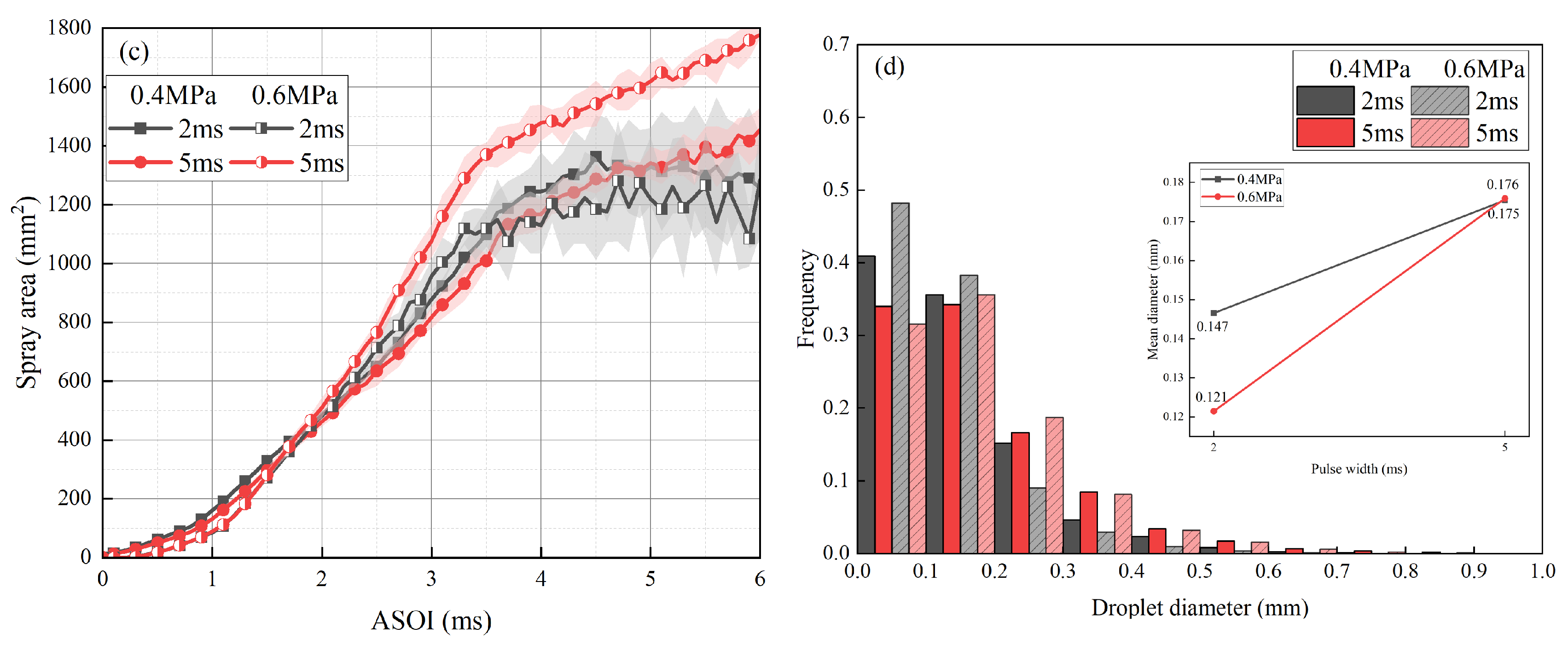 - Adjusting injection strategy effectively improves atomization performance. Increasing the injection pressure from 0.4 MPa to 0.6 MPa shortens the liquid column core, reduces the average droplet diameter by approximately 15%, and enhances spray uniformity. Appropriately shortening the injection pulse width (from 5 ms to 2 ms) decreases droplet collision probability and mitigates wall impingement.