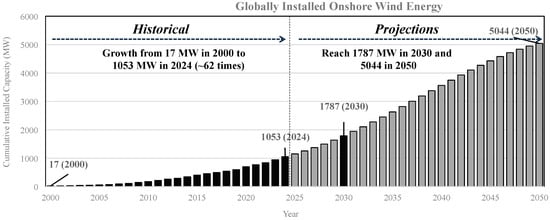The ever-increasing demand for electrical energy to drive economic processes and provide a comfortable living environment for humans has historically been met using fossil fuels [1,2]. However, the increasing concerns about climate change and the projected adverse consequences, the risks associated with the prices of fossil fuels, and the finiteness of fossil fuels, among other reasons, have created a continually growing interest in the utilisation of renewable energy sources (RESs), especially wind energy [3]. Many countries are embracing wind, with wind power generation now being utilised in over 83 countries globally [4]. One of the reasons for this popularity is that wind has higher load factors than other types of RESs [5]. This has led to a significant increase in installed wind capacity worldwide. As Figure 1 demonstrates, the total globally installed wind capacity increased around 62 times from around 17 MW in 2000 to around 1053 MW in 2024, and this capacity is expected to reach the levels of 1787 MW and 5044 MW in 2030 and 2050, respectively [6,7,8,9,10,11,12,13,14,15,16,17].