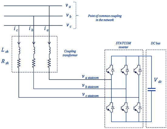 A STATCOM scheme is demonstrated in Figure 4 and its key components entail the DC side capacitor that provides voltage support, a voltage source inverter (VSC) built using the high-power electronic switching devices (either gate turn-off thyristors (GTO) or gate-insulated bipolar transistors (IGBT)), and a coupling transformer that serves to integrate the high power converter to the power systems, in addition to filtering harmonics of the output voltage of the inverter [48,49].