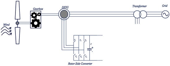 Figure 2 presents the layout of a Type 3 variable-speed, DFIG-type wind turbine [21]. The key components are an induction generator, with a stator connected directly to the grid, and a rotor that interfaces via a back-to-back partial-scale converter comprising the rotor-side converter (RSC) and the grid-side converter (GSC). The pitch controller and the electrical controllers of the converters make up the control system. Although both of these wind turbines have variable speed, the Type 3 DFIG-based WECS offers the advantage of using a partial converter compared to the Type 4 PMSG-based WECS that uses a full converter, making the latter more expensive. Thus, a DFIG-based WECS (DFIG-WECS) has better economic viability and, as a result, contributes more than 50% of the turbines used in the wind energy market [22].
