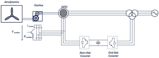 During grid faults, the converters of the DFIGs must be protected from overcurrents and overvoltages. In addition, modern grid codes mandate that DFIG-based WECSs must meet certain LVRT requirements. One of the well-known protection methods is the crowbar. It consists of a three-phase diode rectifier, a switching device (usually a thyristor or IGBT), and a small resistor, as demonstrated in Figure 9. The gate signal of the RSC is turned off during a voltage sag, thereby disconnecting the rotor from the crowbar.