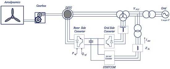 Besides faults within the DFIG, faults in the power system occurring near the DFIG-WECS could bring the voltage at the PCC down to levels below the disconnection threshold, leading to disconnection of the plants, which can result in active power imbalance and power system instability. Installing a STATCOM at the PCC can ensure that [71,72] reactive power is injected into the system to increase the PCC voltage, ascertaining that the DFIG is not disconnected from the system during three-phase-to-ground faults, and it continues to produce active power, thereby assisting in maintaining overall stability.